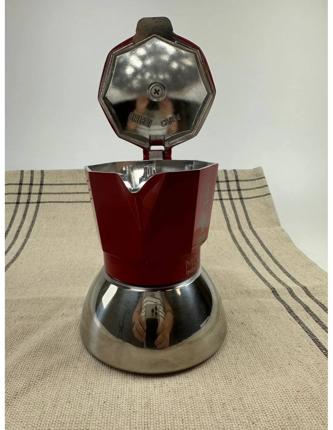 Legendární osmistěnnou moka konvici Bialetti si nyní mohou díky spodní nerezové nádobě užívat i majitelé indukční desky. Vhodná pro 2 šálky (cca 100ml). Použitá / Sleva.
