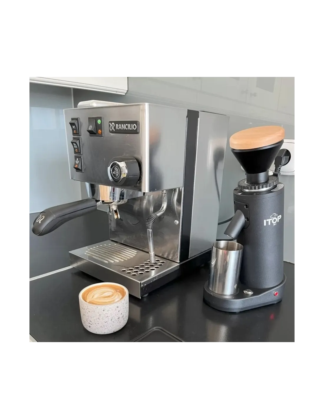 Malý, designový elektrický mlýnek na kávu Kaffia Itop Zero vhodný i na espresso s technologii zero retention - nezadržuje žádnou kávu uvnitř. POUŽITÝ - SLEVA.