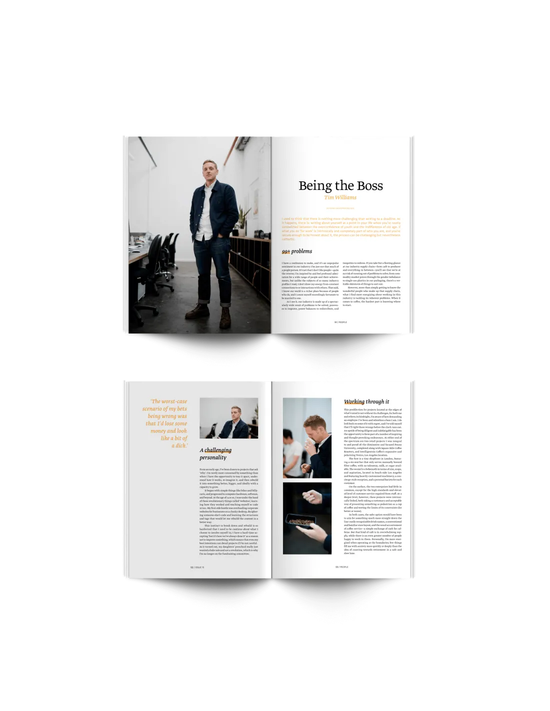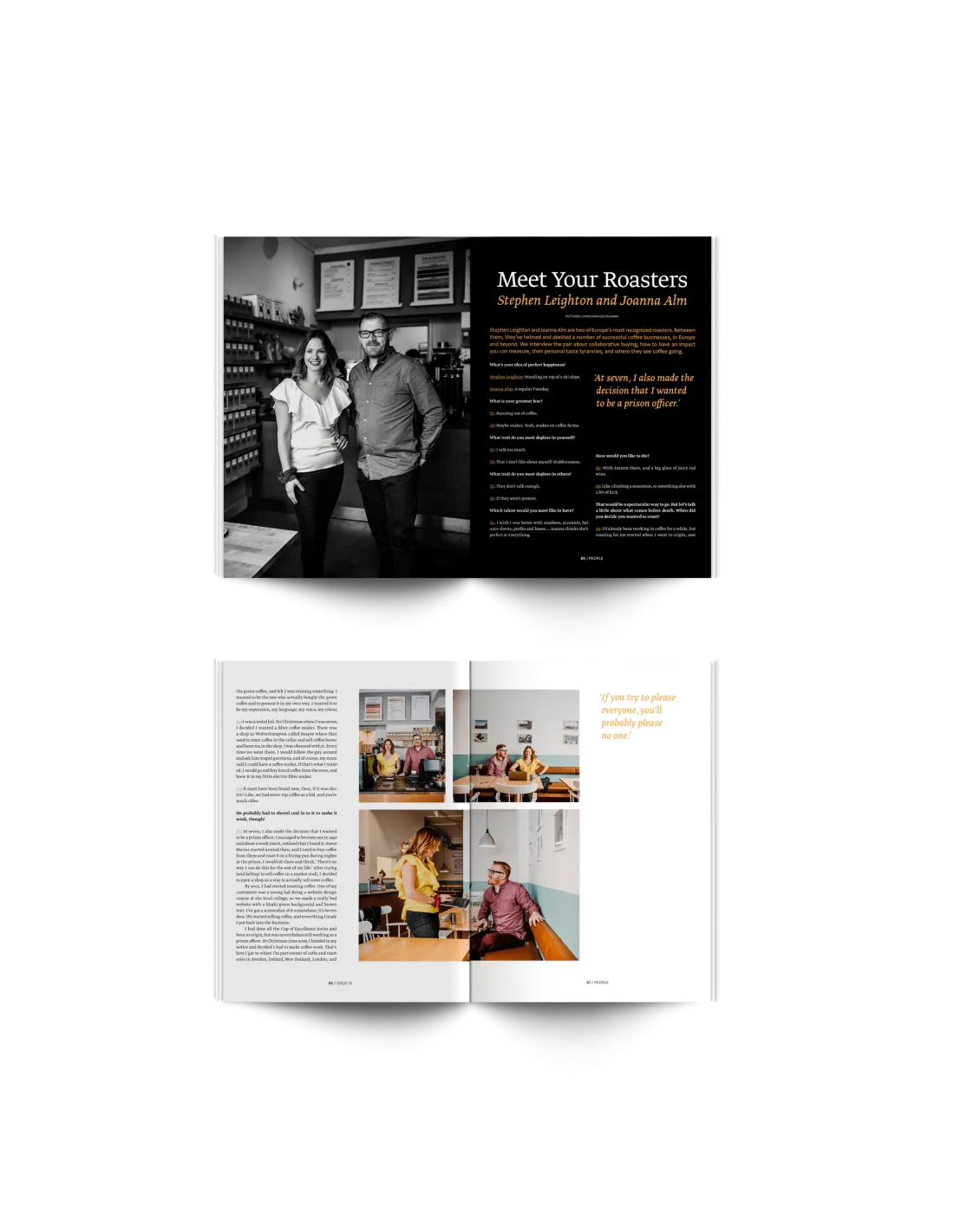 Kapitola "Lidé" je plná příběhů o lidech, kteří tvoří kávové odvětví - od rozhovorů se světoznámými pražírny Stephenem Leightonem a Joanna Alm, přes zápisky ze života v New Yorku až po nádherně vystižení reminiscenci životních lekcí od Tima Williamse.