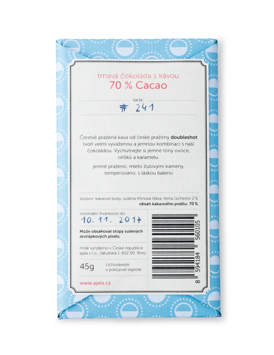 Čerstvě pražená káva od české pražírny doubleshot tvoří s čokoládou Ajala velmi vyváženou a jemnou kombinaci.
