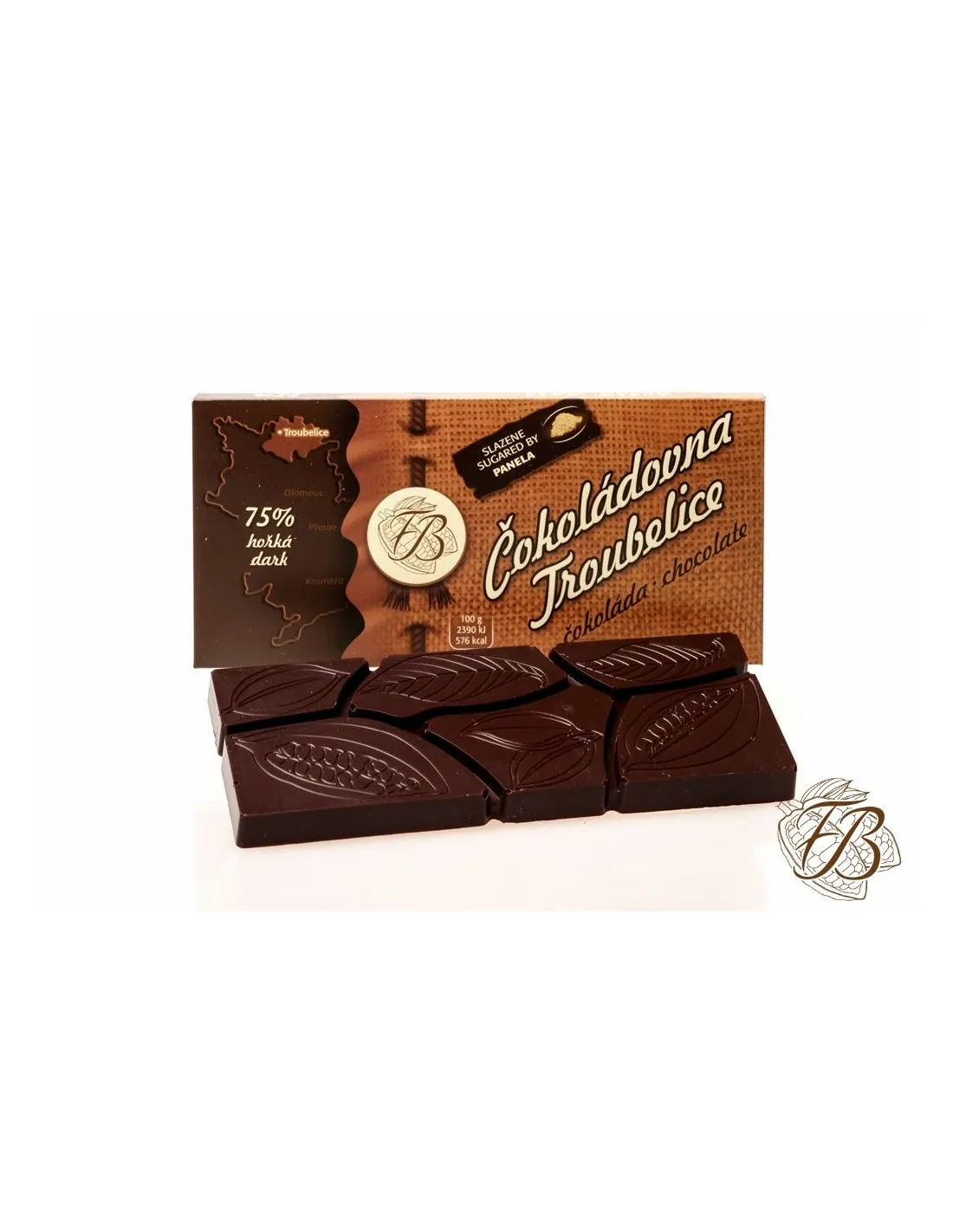 Hořká 75% čokoláda, příjemně hořká s jemnou chutí, slazená třtinovou šťávou panelou.