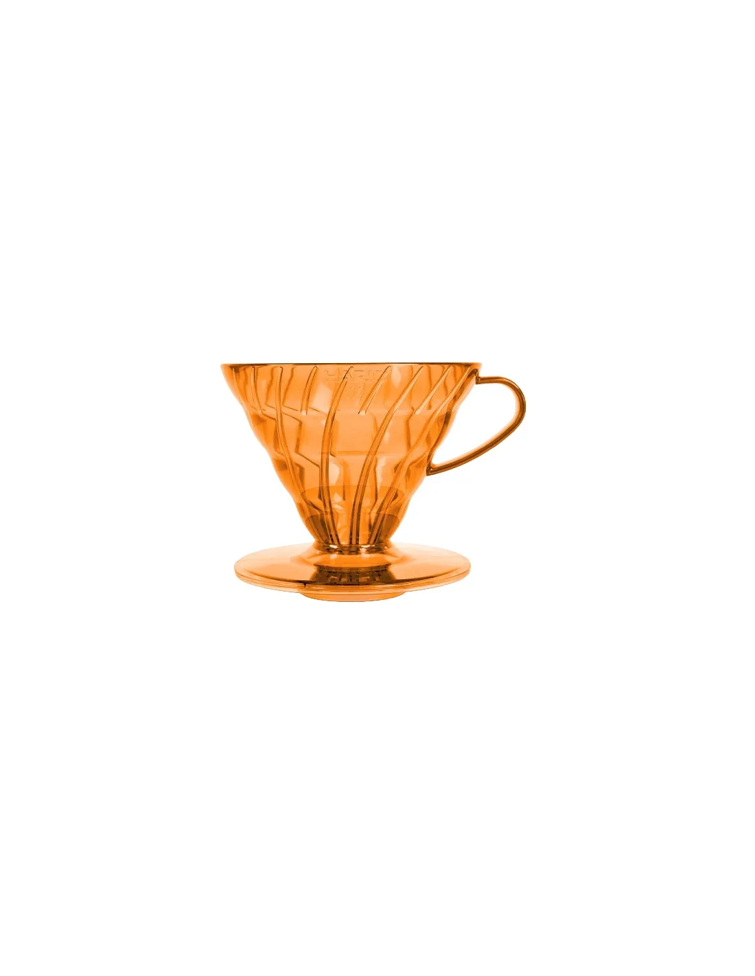 Plastový dripper Hario V60 pro snadnou přípravu 1-4 šálků filtrované kávy. Oranžové provedení.