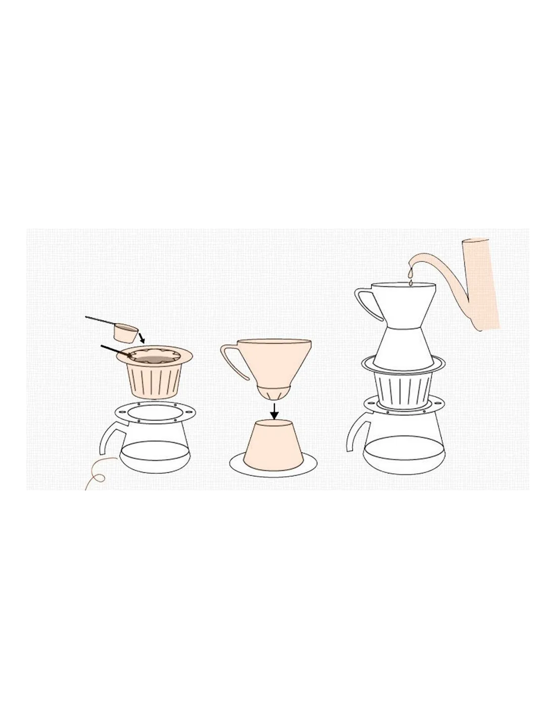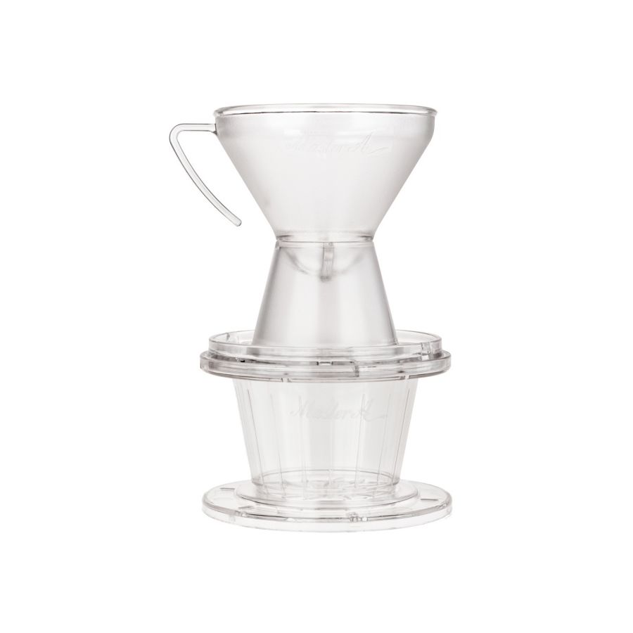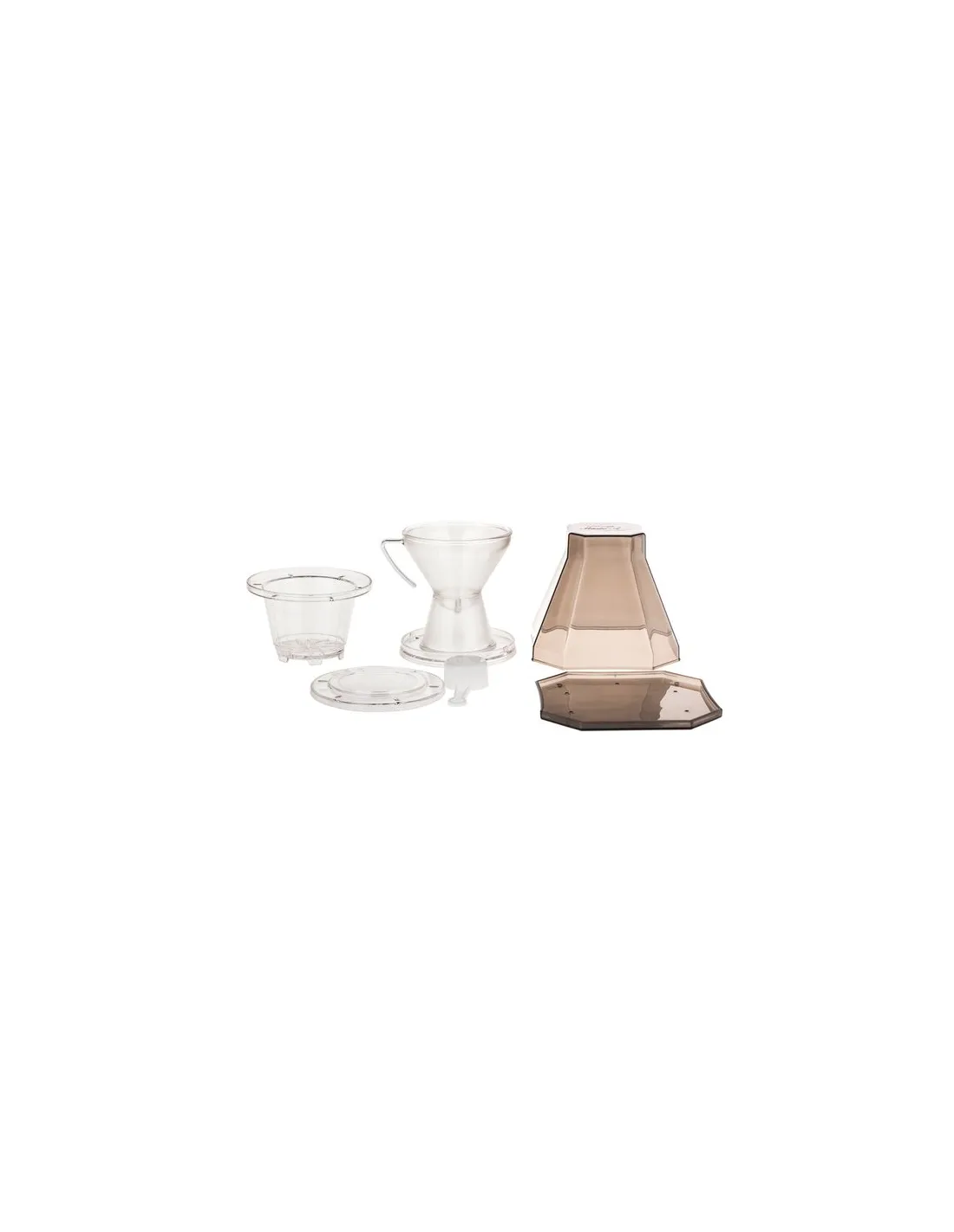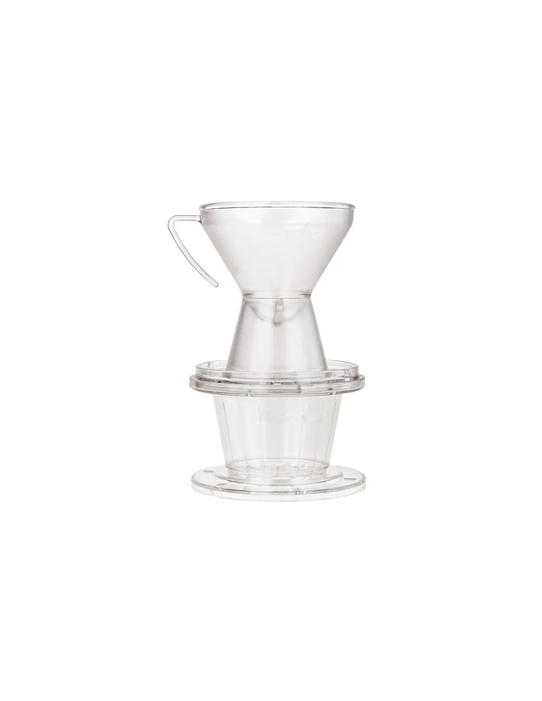 Tento plastový dripper se skládá ze 4 částí: nádobka na vodu, sprchová výpust, samotný dripper a nástavec pro případ, že dripper nepasuje na váš oblíbený šálek či konvičku. Balení také obsahuje plastový box, který můžete využít při cestování.