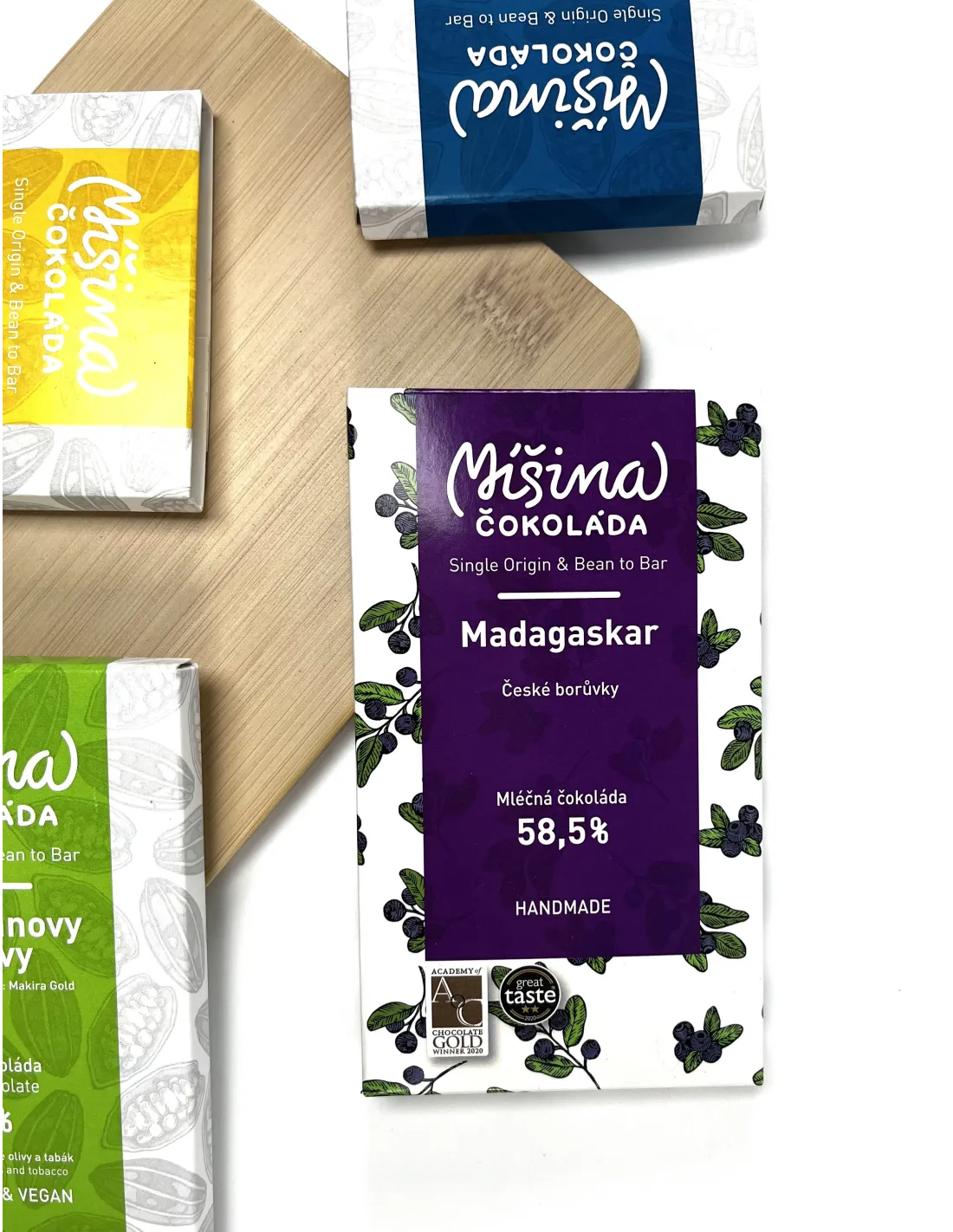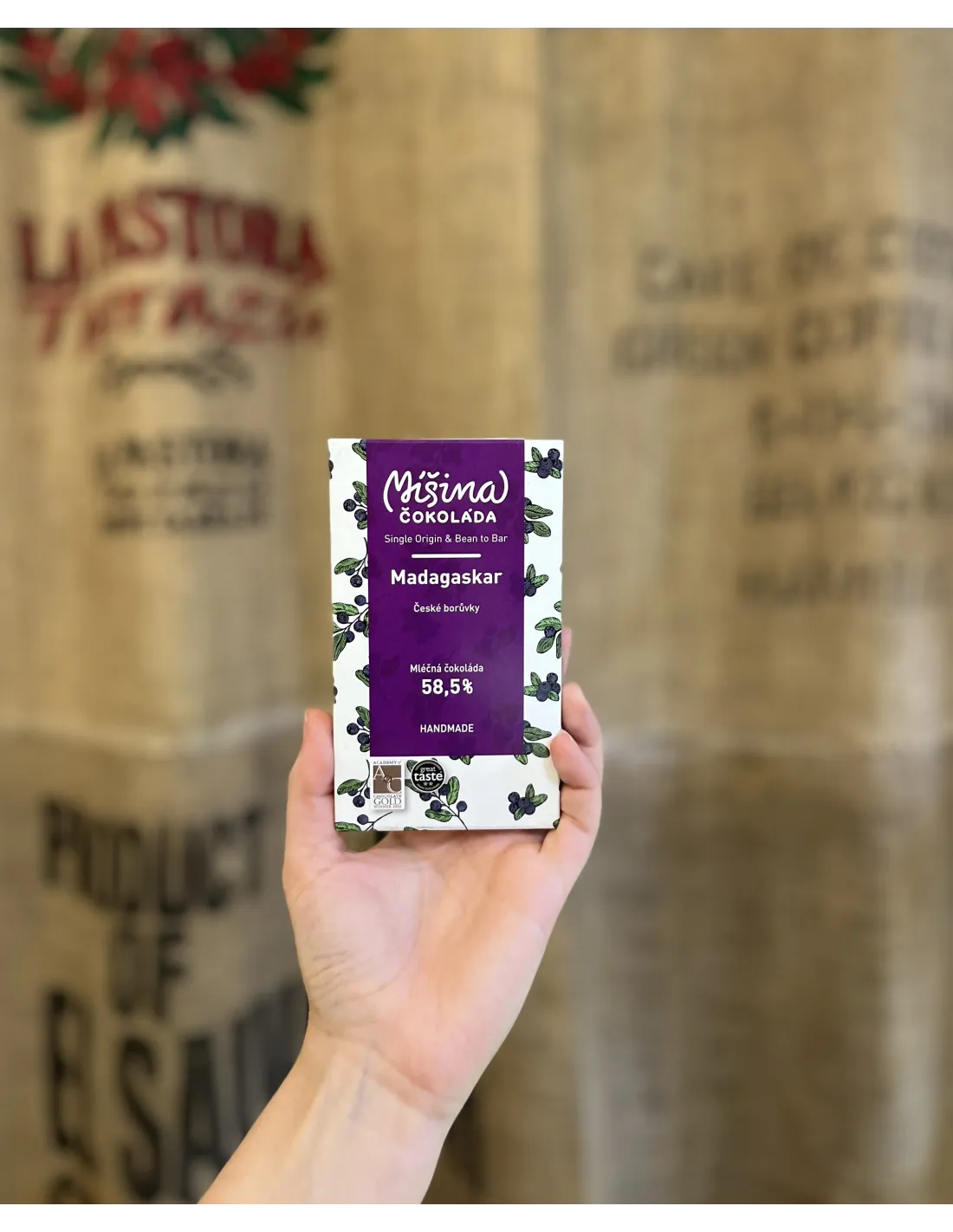Mléčná čokoláda z organických kakaových bobů z Madagaskaru. Tyto boby chutnají po ovoci a přidali k ním ještě borůvky z českých lesů.