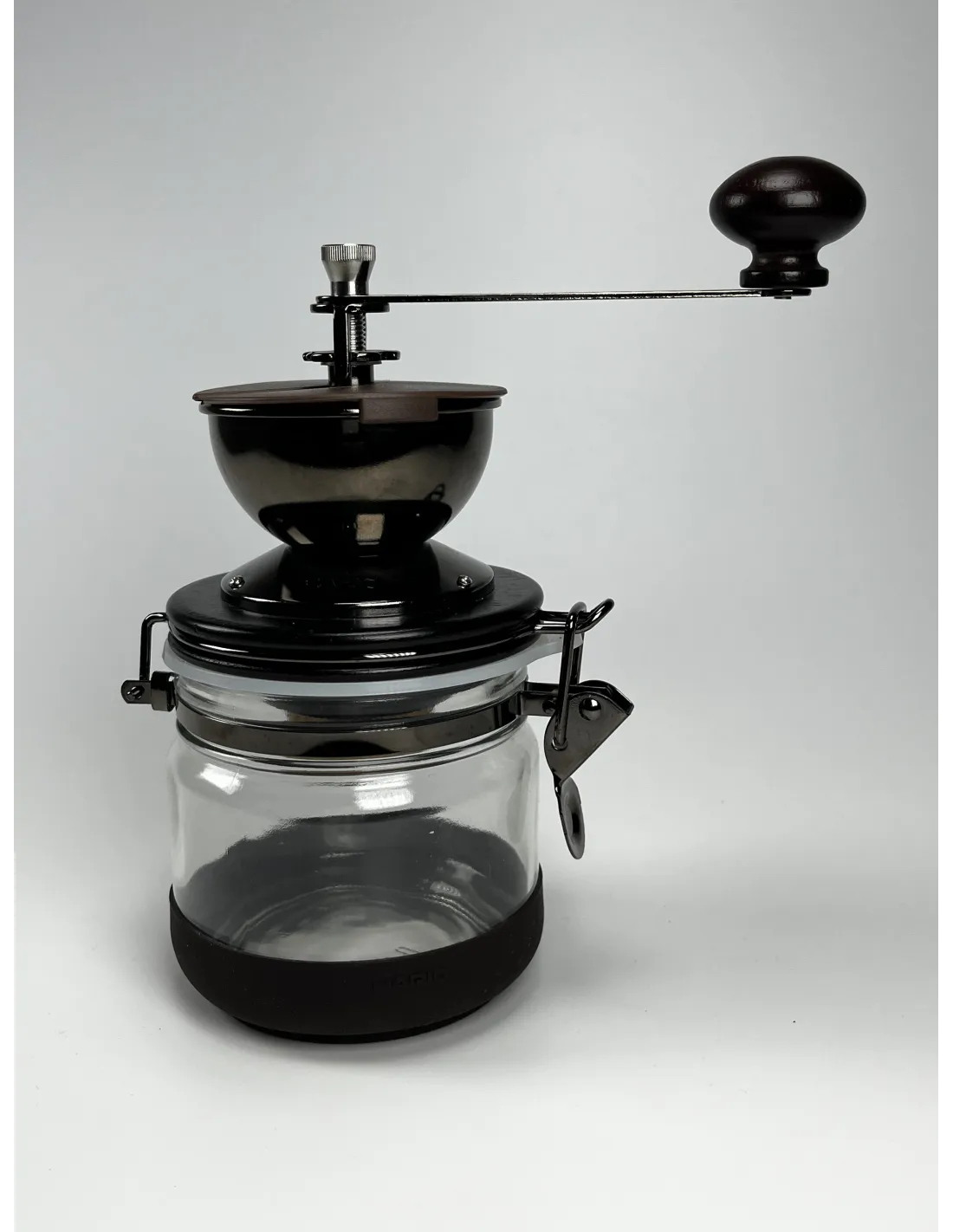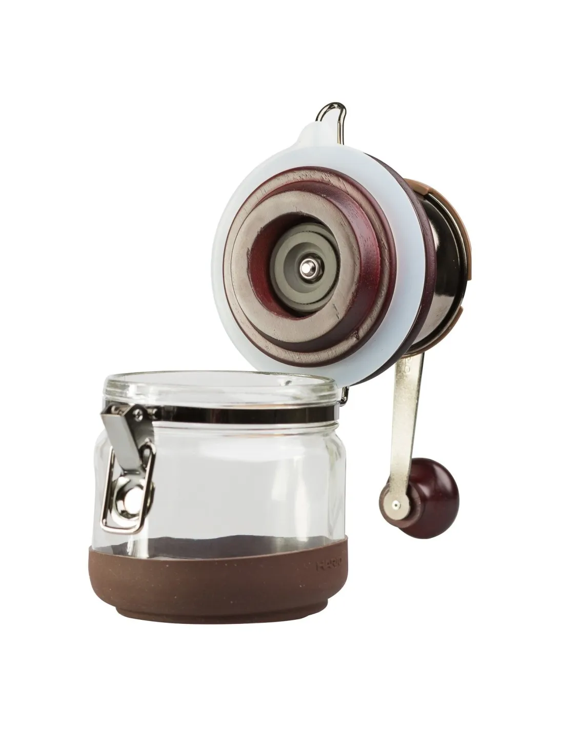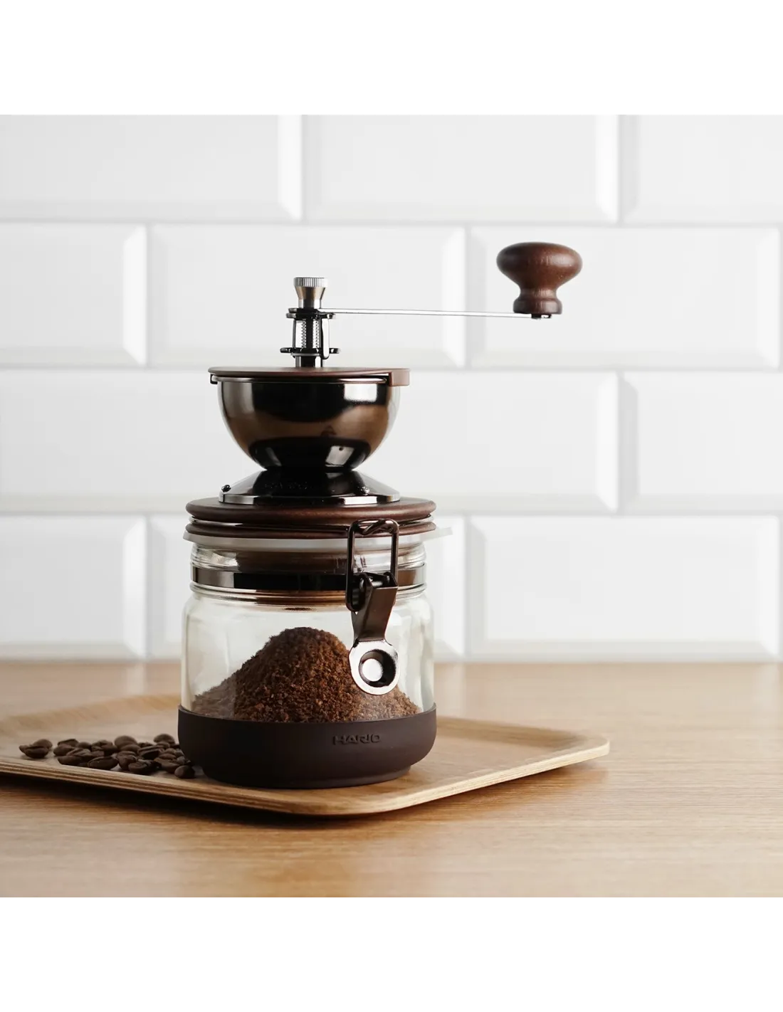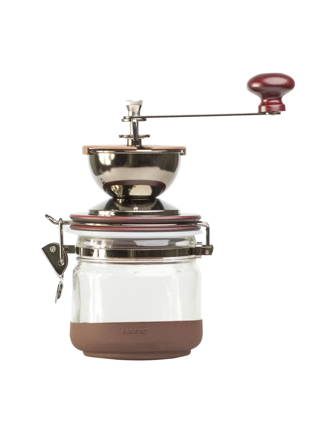 Nejnovější verze ručního mlýnku Hario Canister (CMHN-4) s keramickými mlecími kameny, nastavitelnou hrubostí mletí a velkou těsněnou nádobou pro uchování čerstvě namleté kávy.