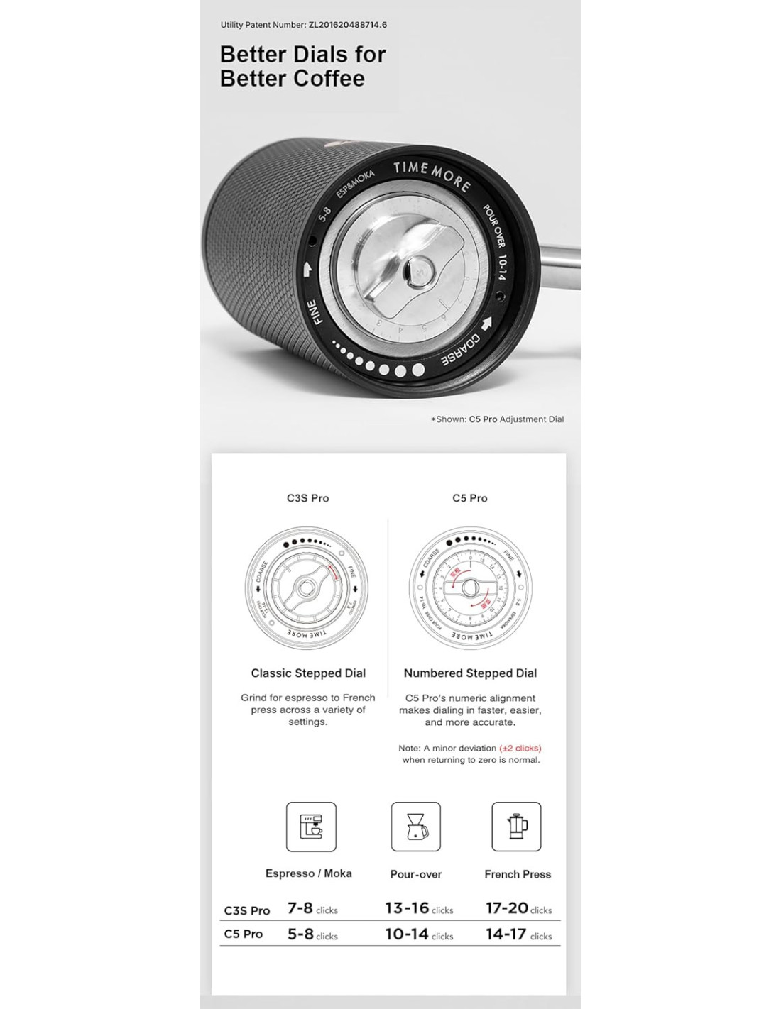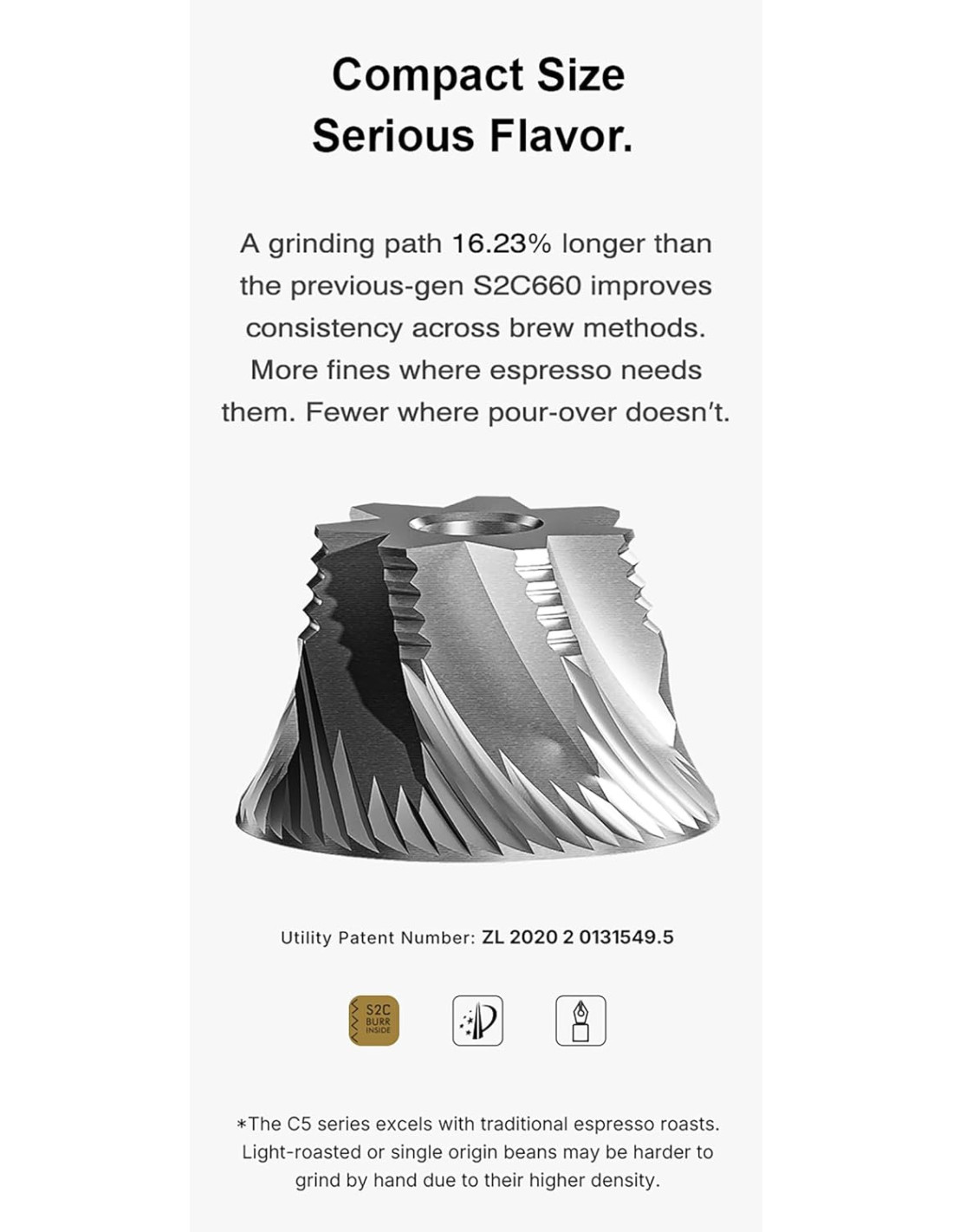 Ruční mlýnek Timemore C5 Pro Black z nové generace řady C přináší mimořádnou kombinaci přesnosti, výkonu a odolnosti. Je vybaven inovovanými mlecími kameny S2C-042-III o průměru 42 mm, které umožňují rychlejší, rovnoměrnější a stabilnější mletí než předchozí modely.