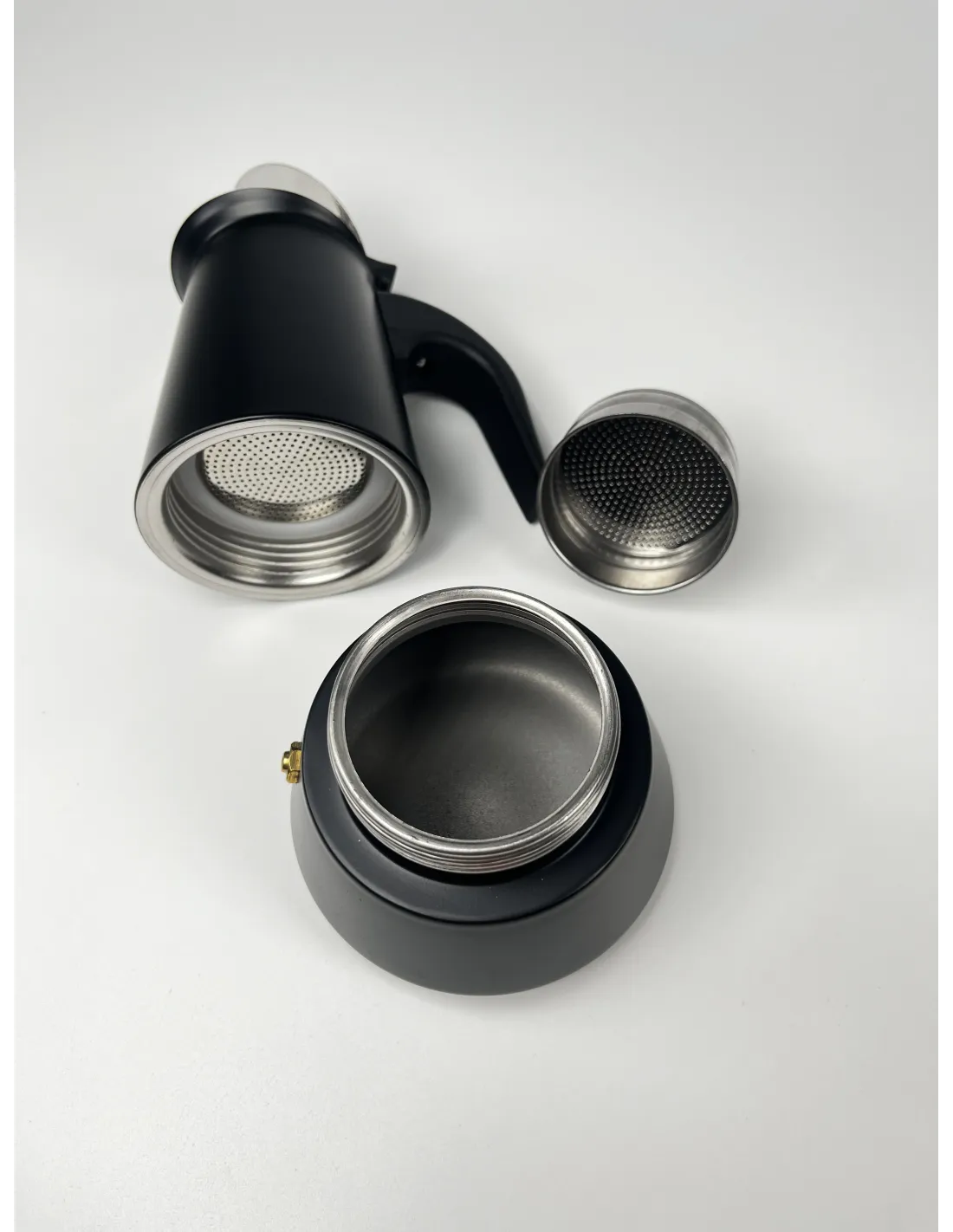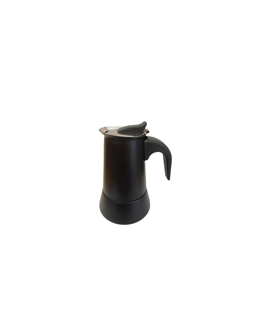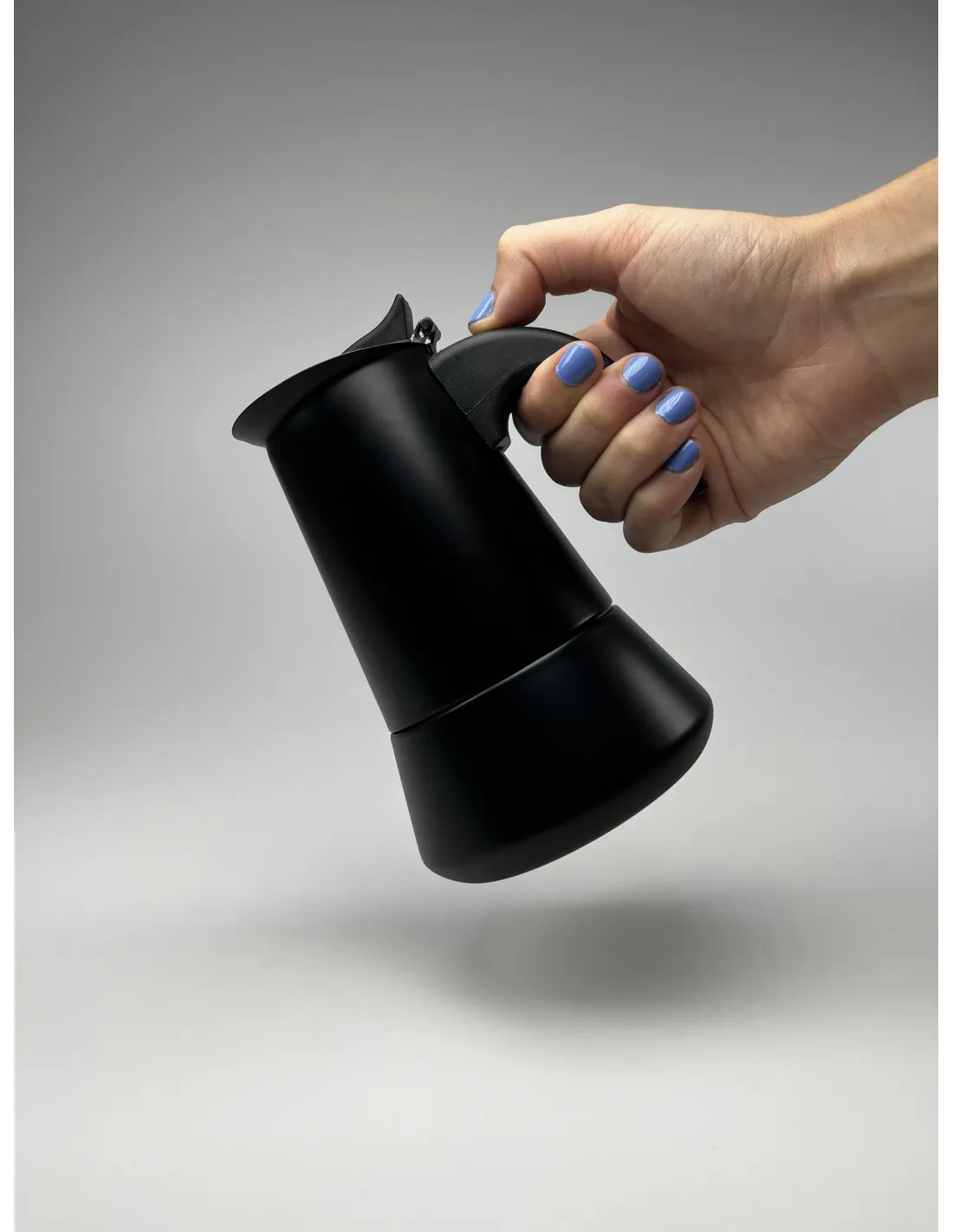 Nerezová černá moka konvice Kaffia pro přípravu 4 šálků mocca kávy. Jednoduchý způsob přípravy velmi blízký espresso, ovšem za zlomkové náklady. Objem: cca 201,5 ml. Vhodná i pro indukční desky.