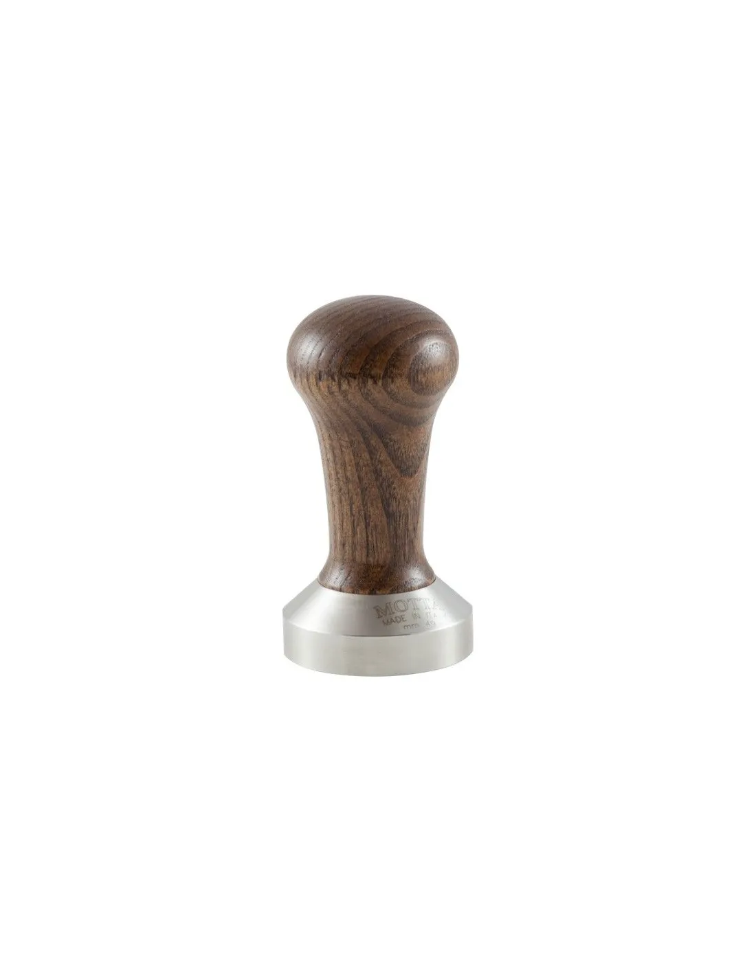 Profesionální tamper Motta má kovovou základnu a ergonomickou dřevěnou rukojeť a jeho váha je 350g.