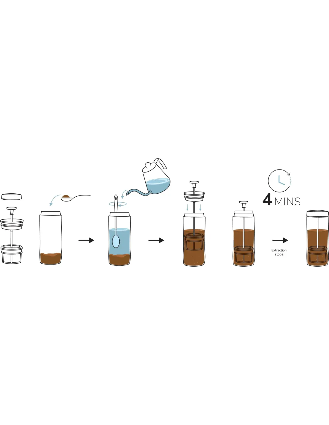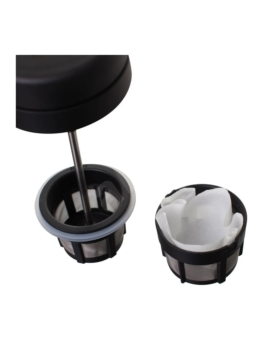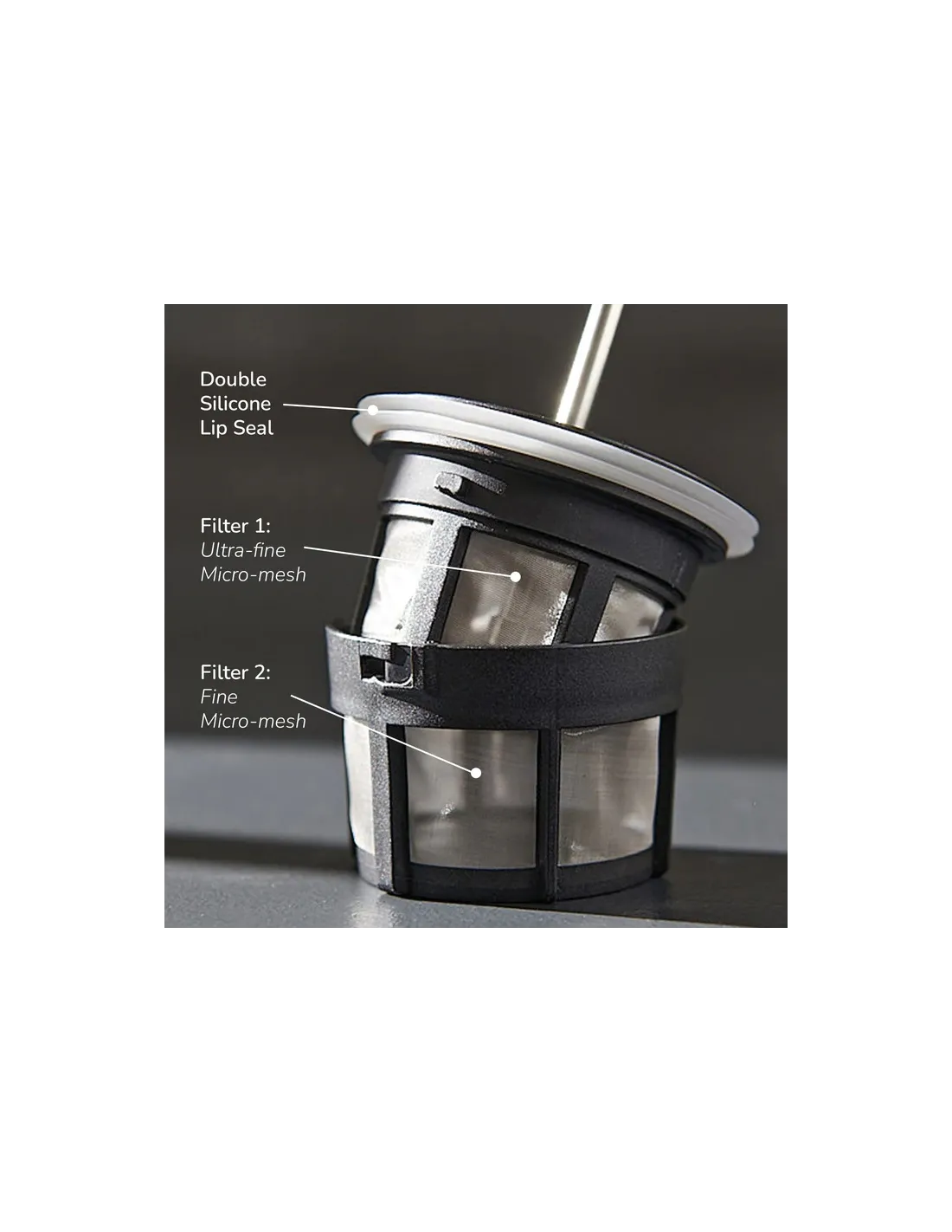 Druhou inovací je způsob stlačení samotného filtru, který po úplném stlačení pístu na dno zabrání pokračování extrakce, tj. pronikání vylouhované kávy zpět do nápoje. Vyrovnávací prostor mezi dvěma filtry vylouhovanou kávu bezpečně oddělí.