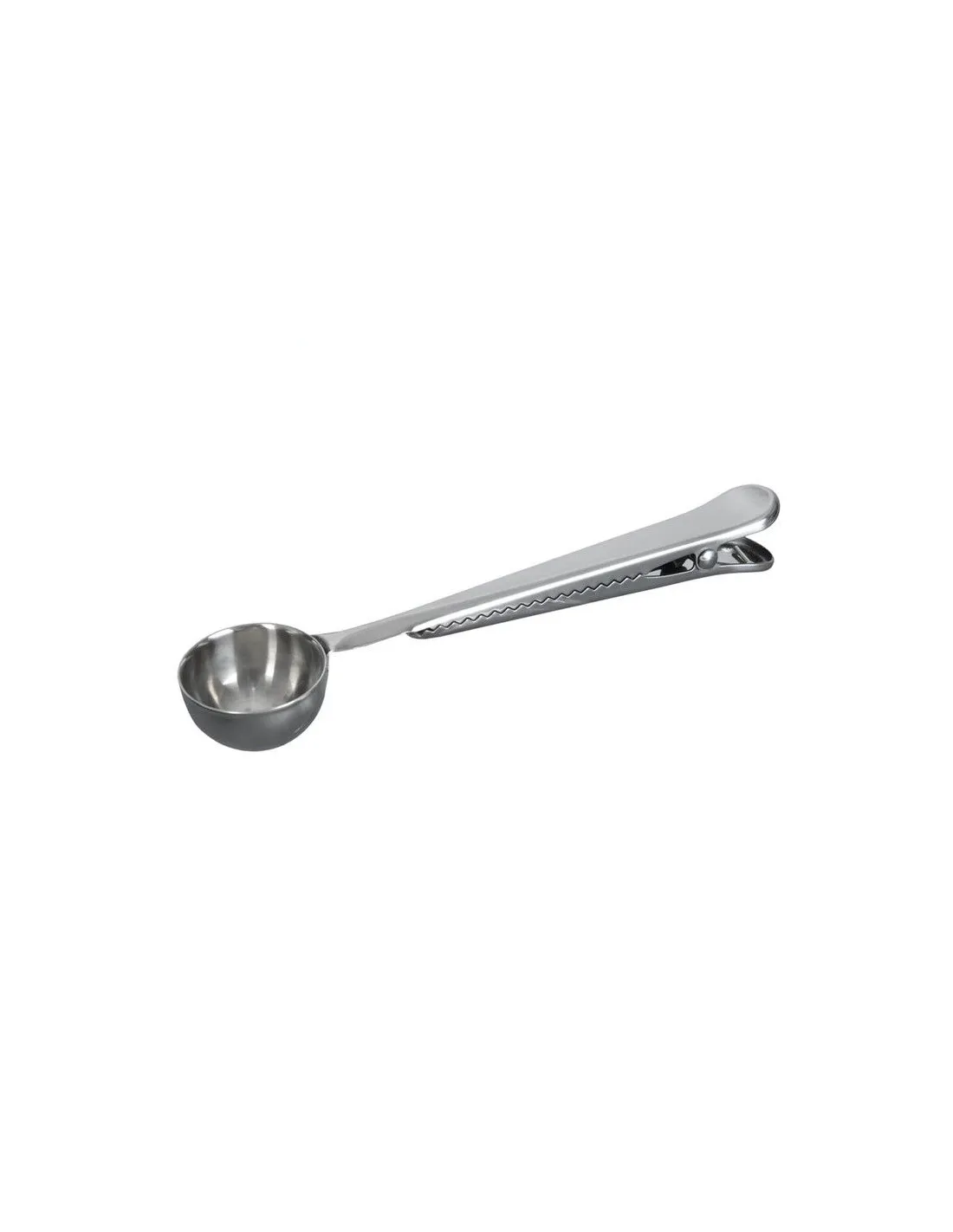 All stainless steel measuring cup for convenient measuring of 6g of ground coffee and closing the coffee packet with a clip.