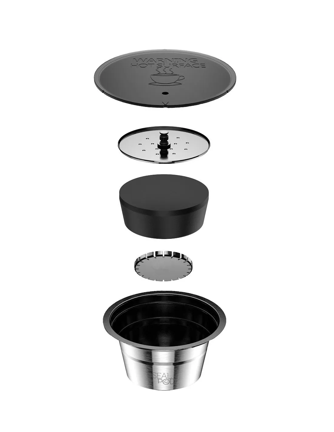 Each package contains: 1x stainless steel Sealpod capsule, 1x stainless steel filter, 1x stainless steel lid, 1x silicone lid.