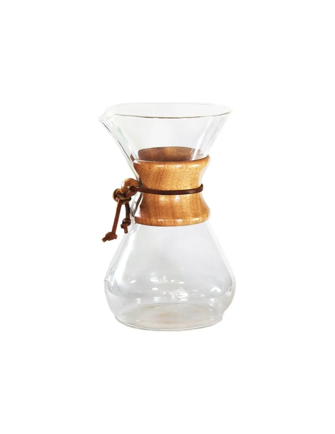 TheChemex, at first glance resembling a water carafe, is made of borosilicate glass and has a wooden corset in the middle tied with a leather strap.