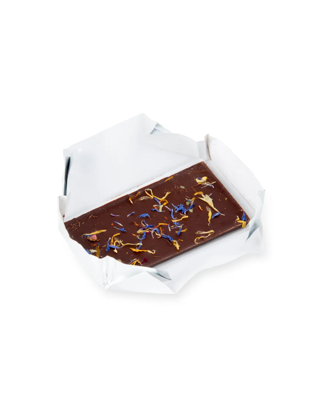At the first bite , you will feel the power of the cocoa beans and the energy of the wild orange . These are complemented by the fragrance and protective effects of the meadow flowers that decorate it. Gently roasted, ground with granite stones, tempered, packed with love.