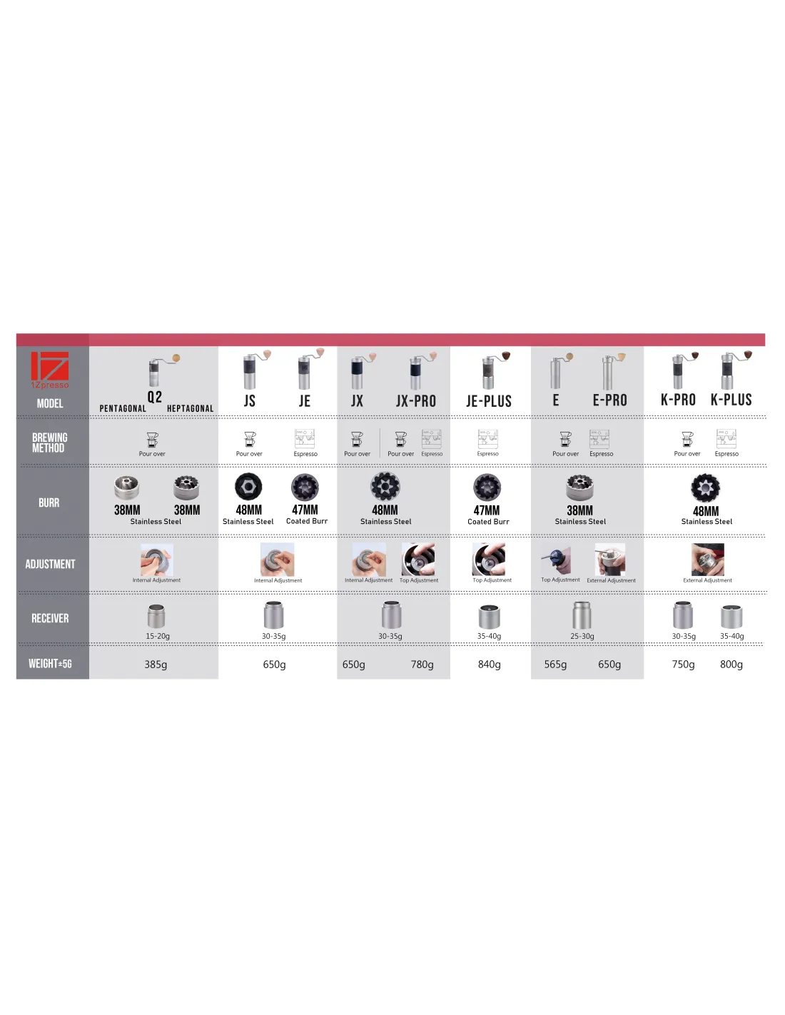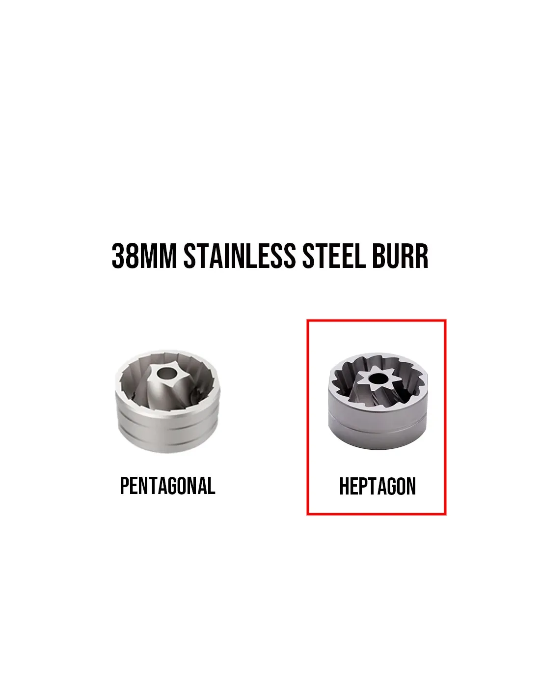 The Stainless Steel heptagonal conical burrs ensure your grinder lasts for multiple uses all year round with increased effortless grinding over the previous Q2 model - the pentagonal.