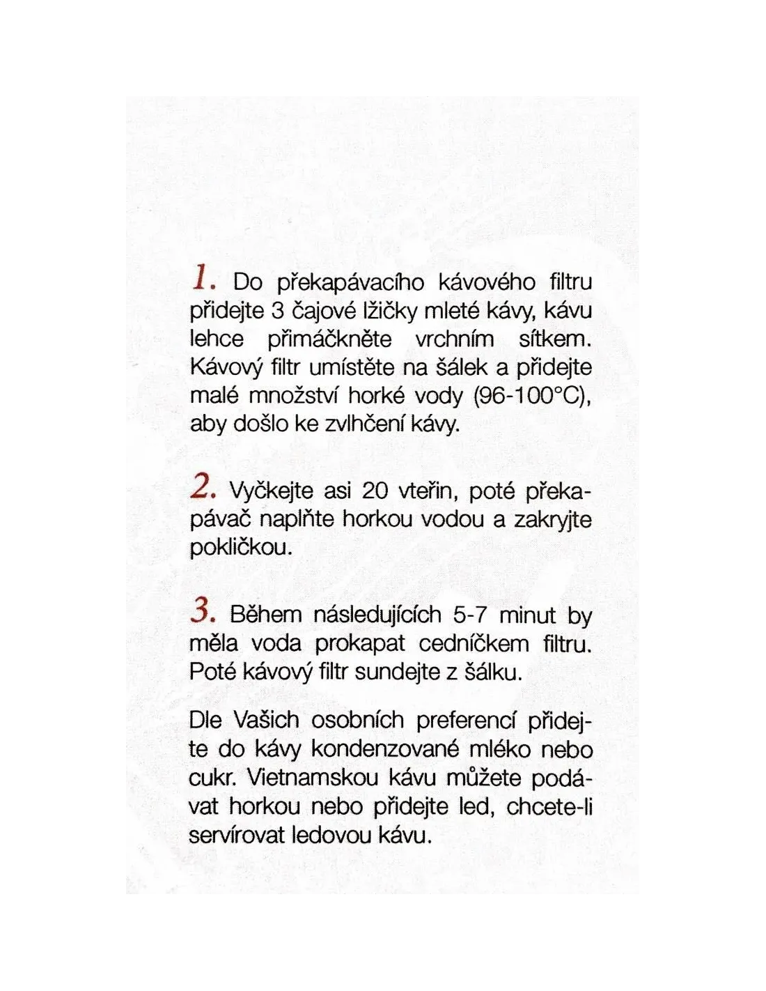 If this question also comes to mind, believe me, there's a reason for that too. The coffee is ground directly in Vietnam using traditional technology, and this too gives it a specific aroma and the ideal coarseness for brewing in a Phin filter. Although this is against the classic gourmet's wishes, the coffee retains its specific aroma even in vacuum packaging.