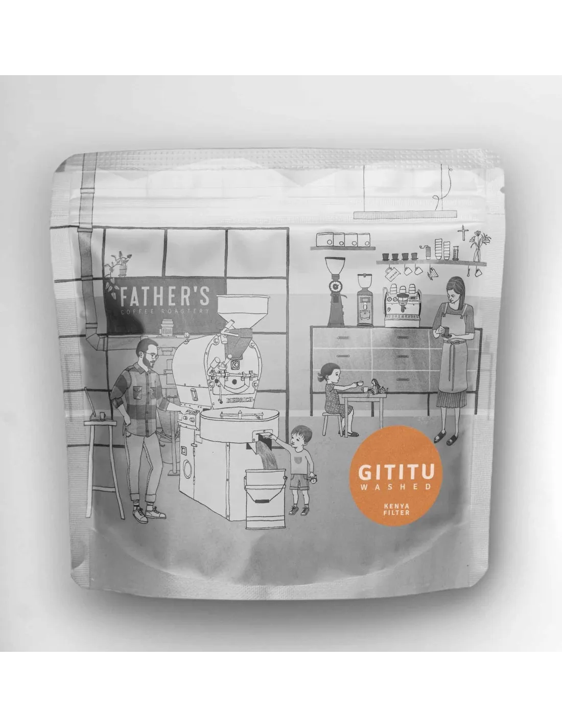 This year's first Kenya from Fathers comes from the Gitutu processing station, located in the Nyeri region. The plant itself, as processing stations in Kenya are called, is located at the foot of Mt. Kenya. This lot, labelled AA, which in the Kenyan system indicates the largest bean size and therefore the highest quality, does not have the typical profile of coffees for this country. Gitutu AA coffee is characterised by a rather higher sweetness, juicy body and spicy notes of vanilla or cola.