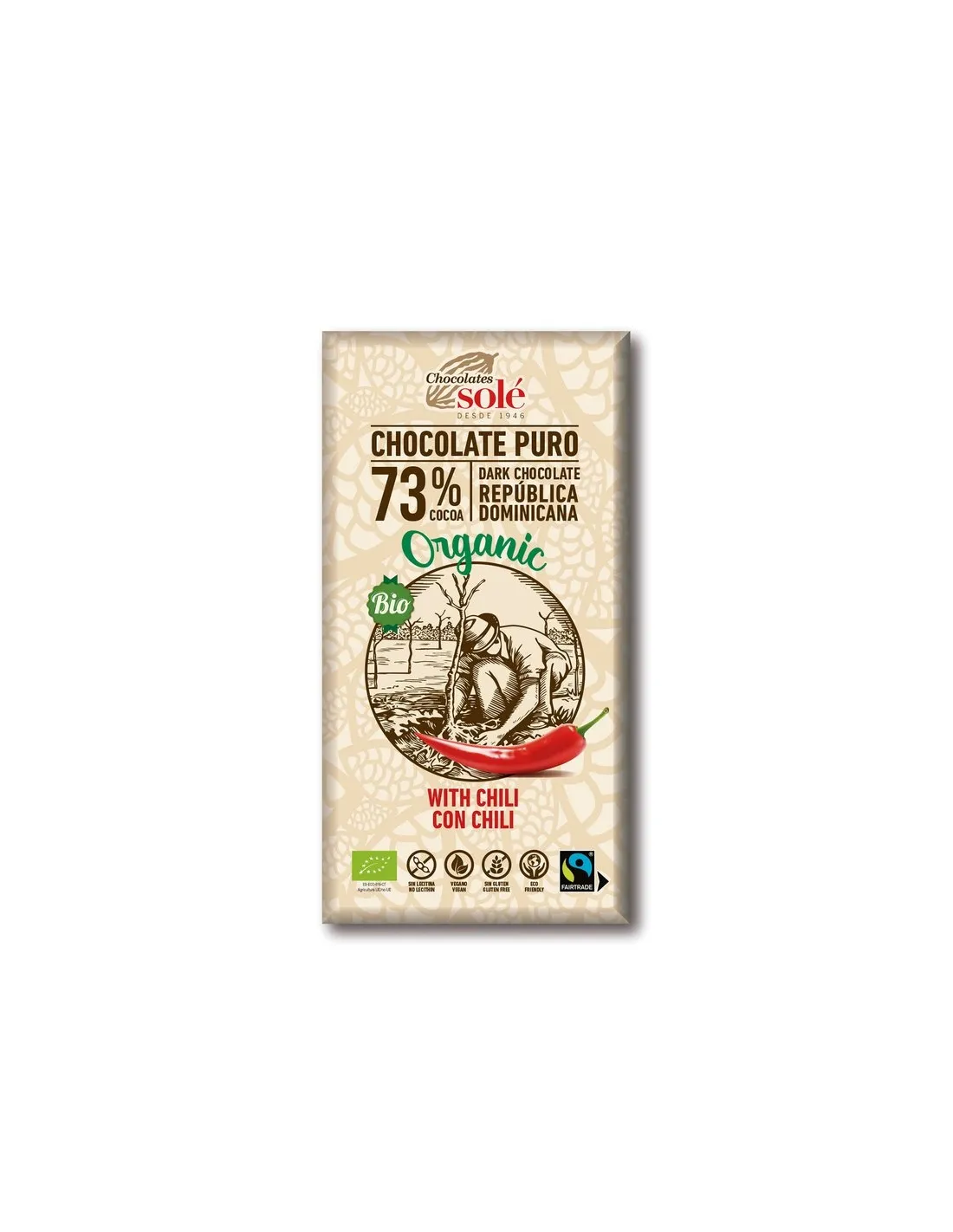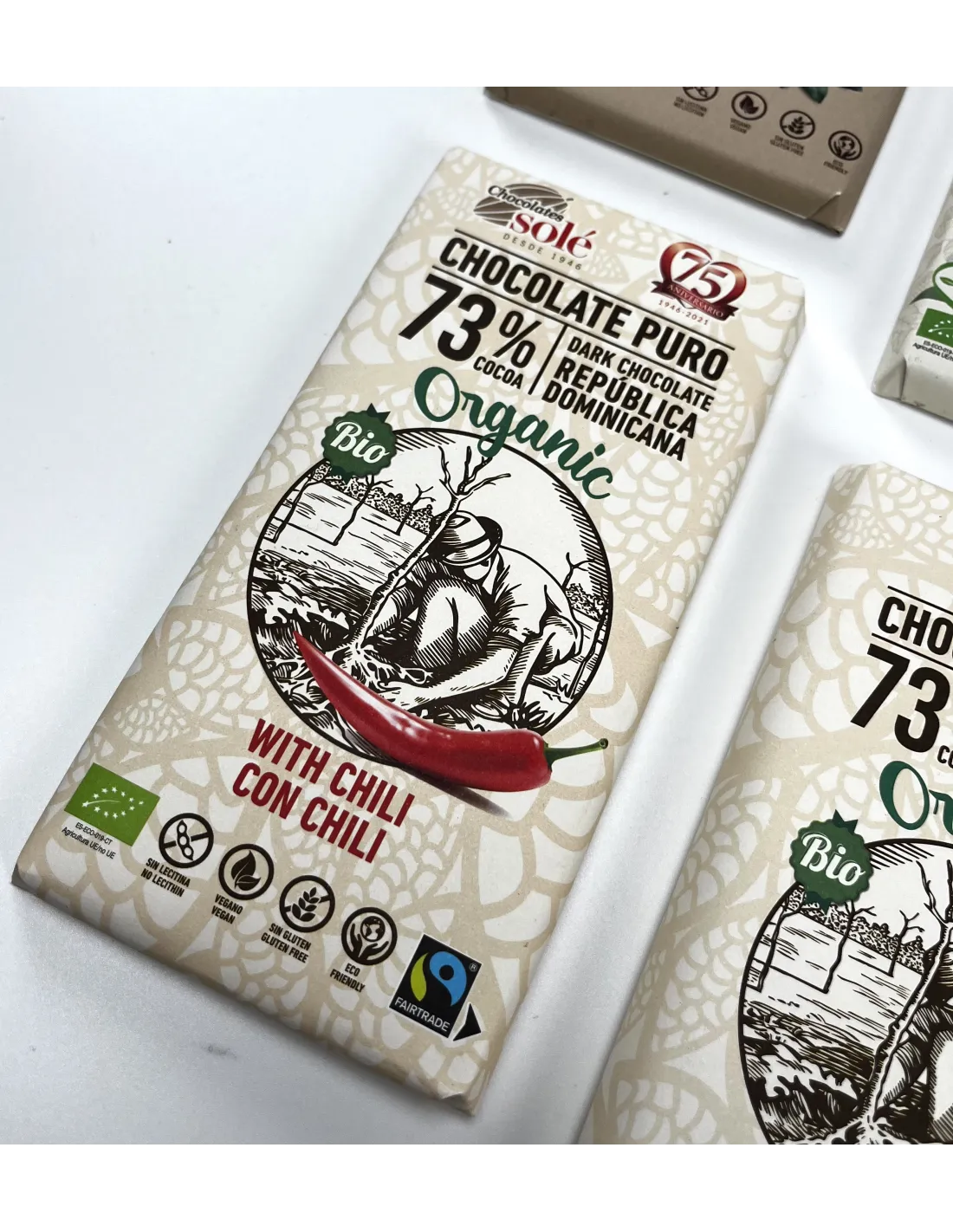 This exceptional chocolate combines premium Dominican cocoa (73%) with natural cane sugar from Brazil and a spicy hint of dried chilli.
