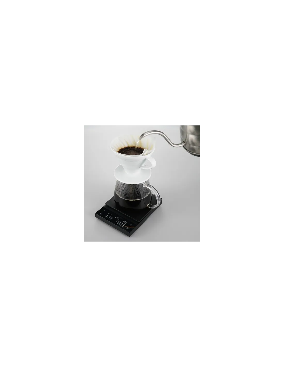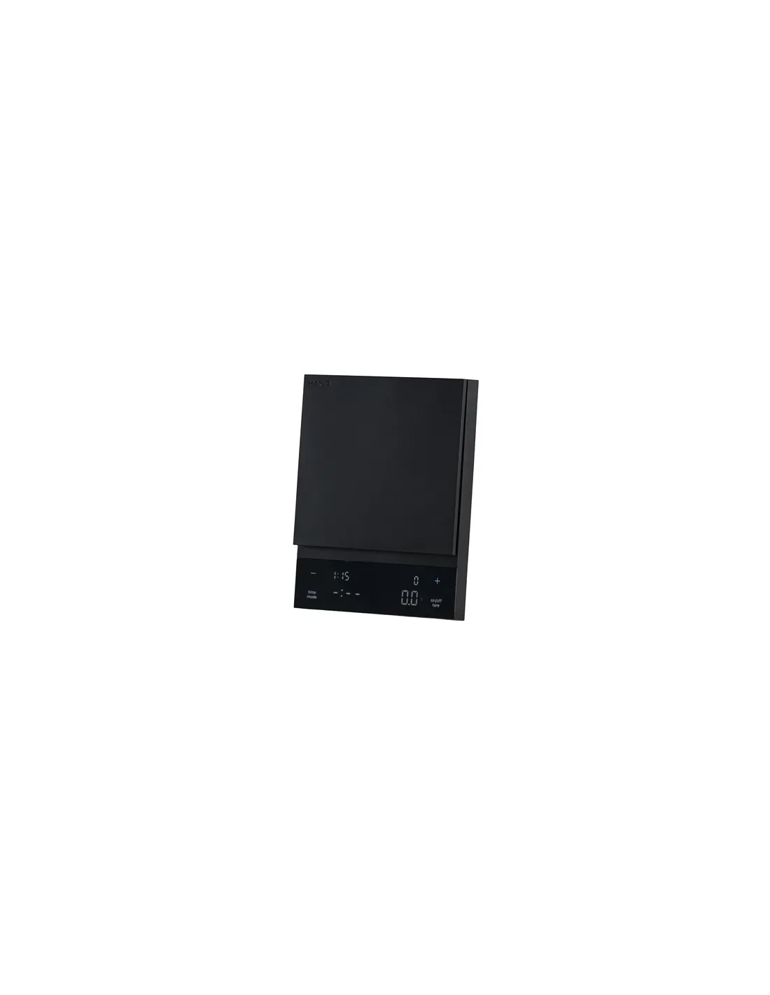 The scale impresses with its minimalist and elegant design with high quality materials and precise workmanship of every detail. The housing is made of smooth, matt plastic, which contributes to the overall impression of cleanliness and modern appearance. Thanks to its compact dimensions, the scale easily accommodates accessories such as Chemex, dripper or AeroPress.