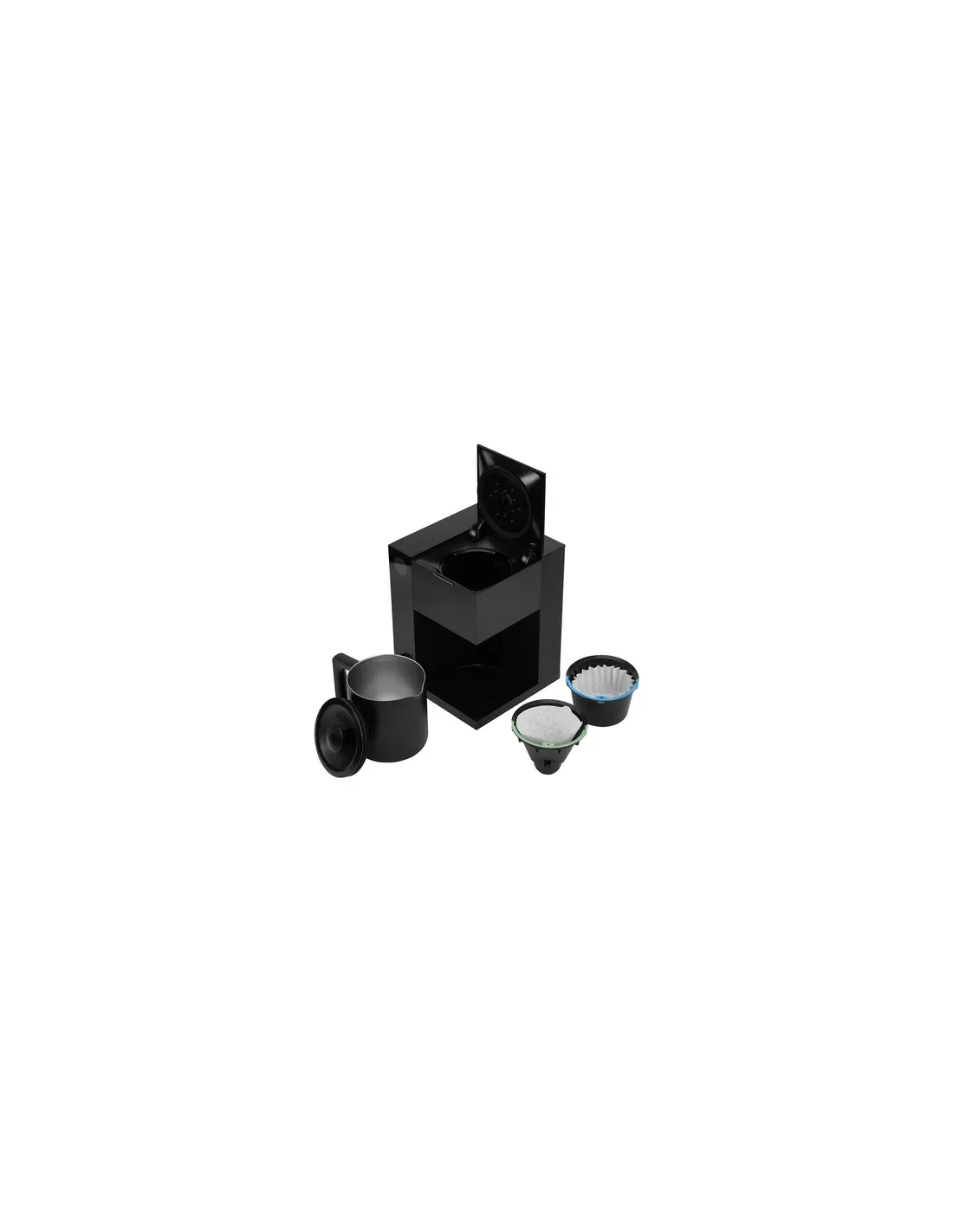 Package includes: coffee maker, kettle, water tank, filters (15 cone filters and 15 flat bottom filters), 2x filter basket (cone and flat bottom)