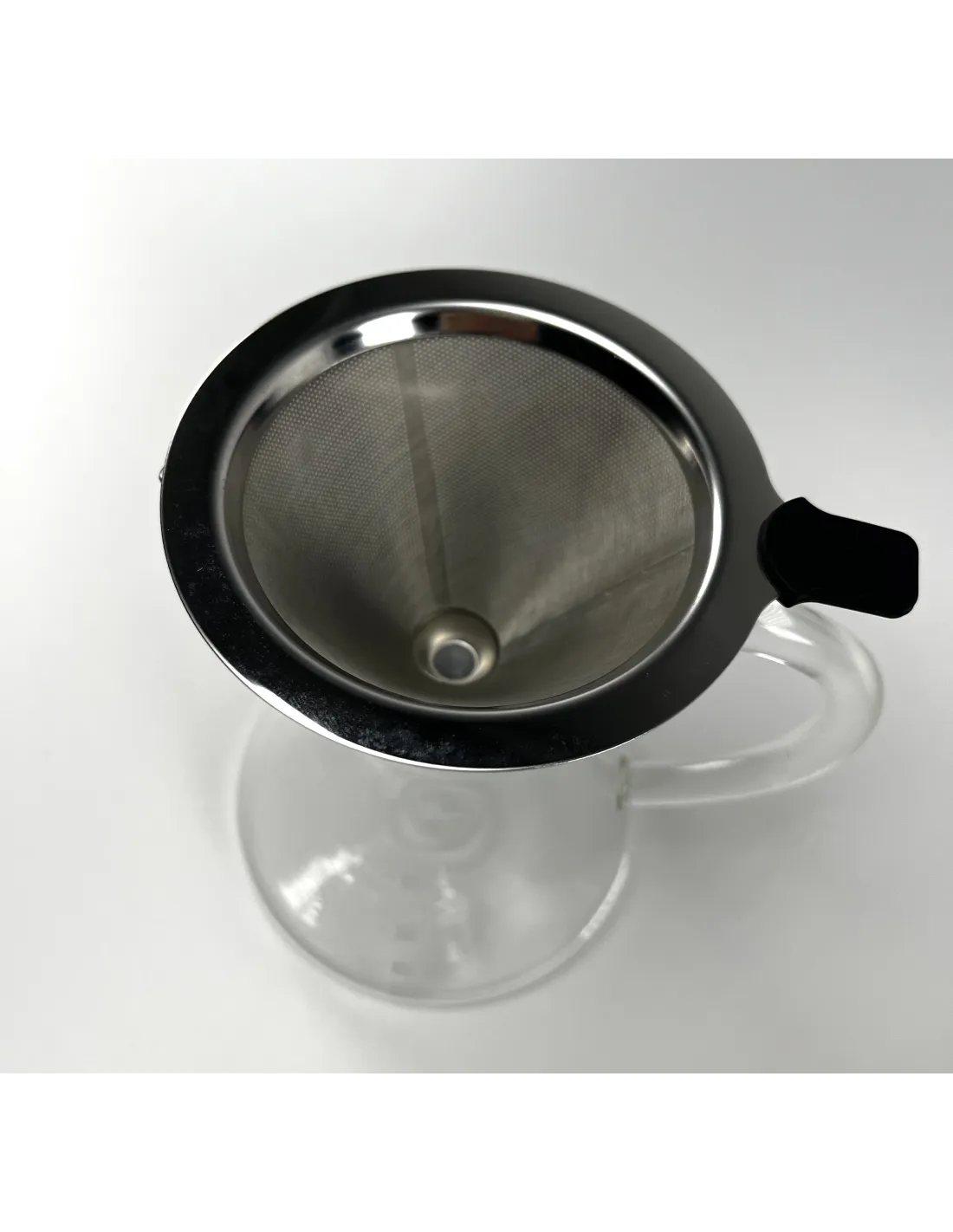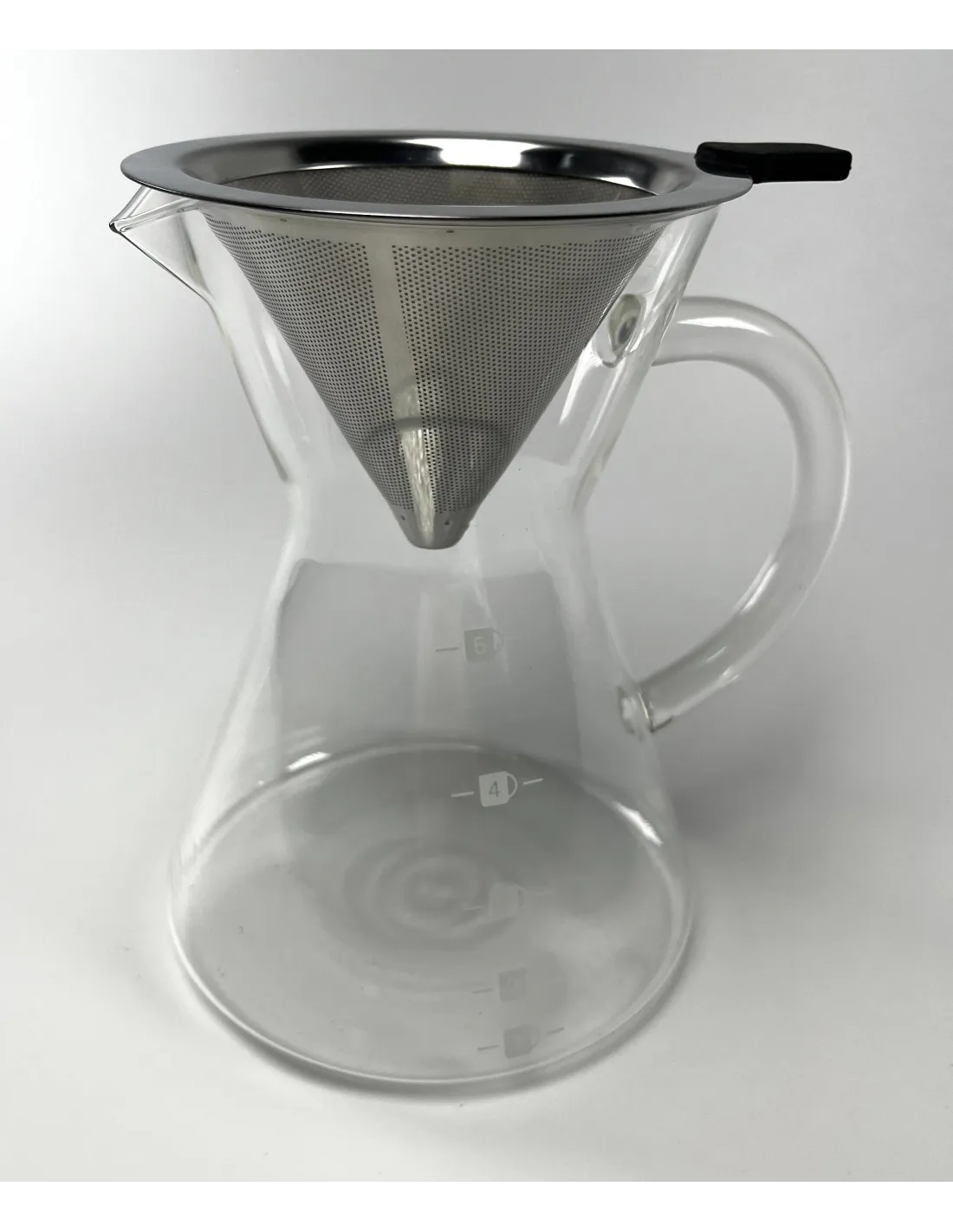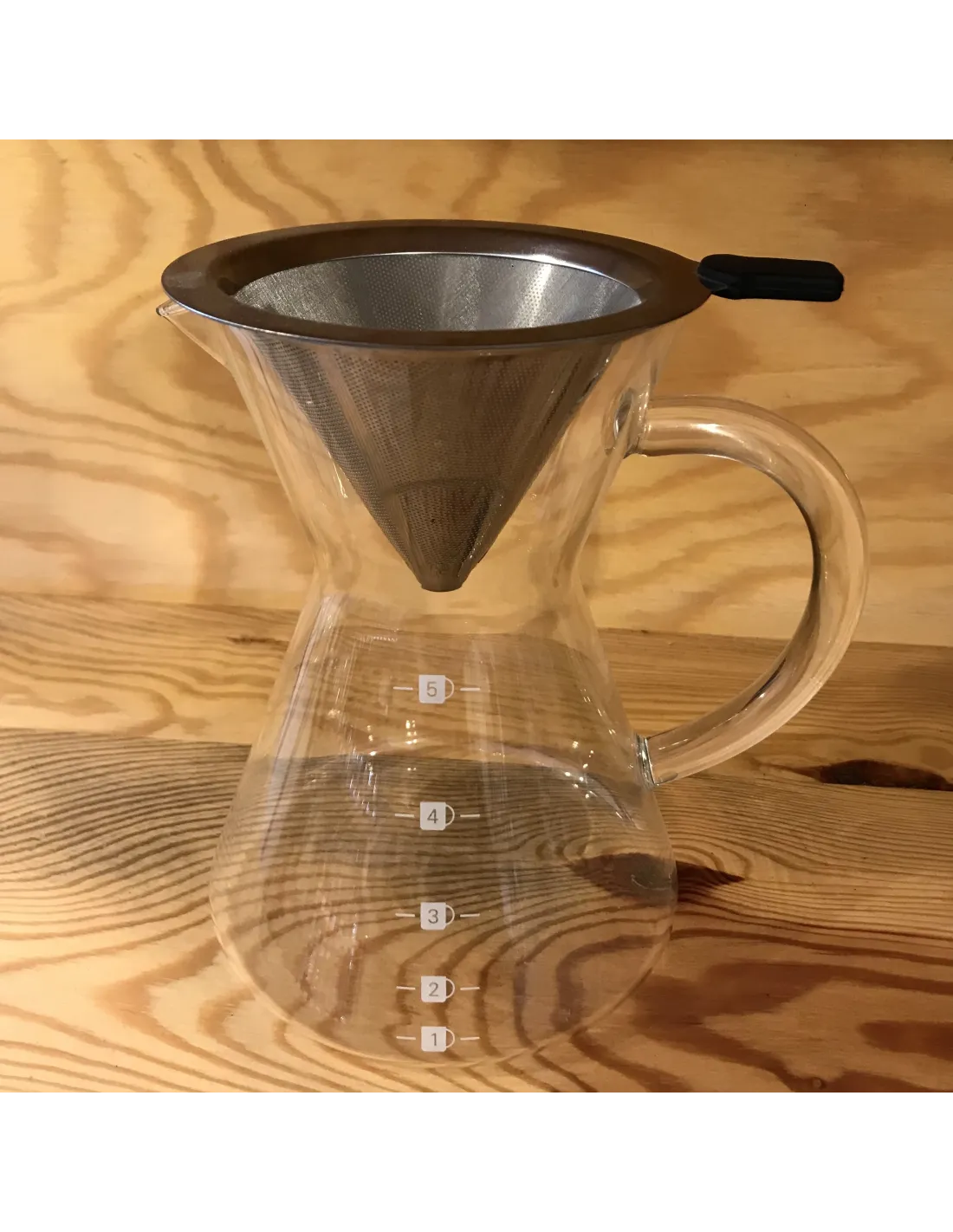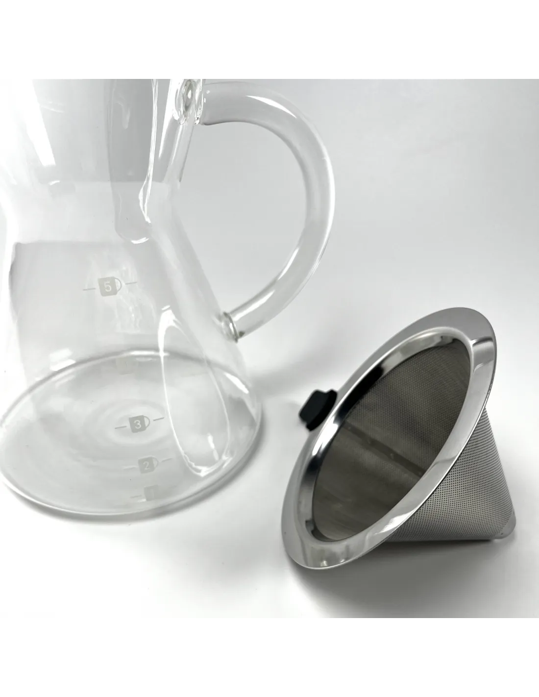 The Kaffia Kone decanter features a fine metal filter from which the extracted coffee overflows directly into a jug from which the coffee can be served directly. It is also an interesting alternative for those who do not like paper filters in a dripper, which will be both a much more economical and more environmentally friendly solution. The metal filter also lets more of the fine coffee oils through than other filters, giving the coffee a more substantial body.