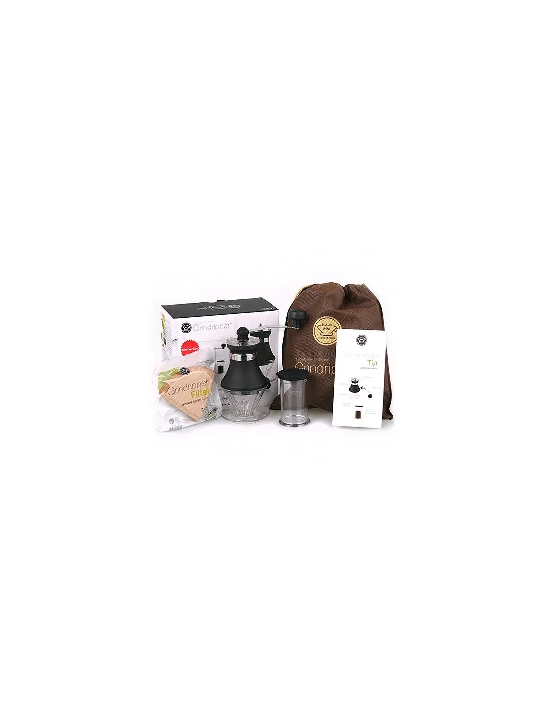 Package contents: coffee grinder with ceramic grinding mechanism, plastic dripper, coffee tray with lid, travel case, 50pcs paper filters.