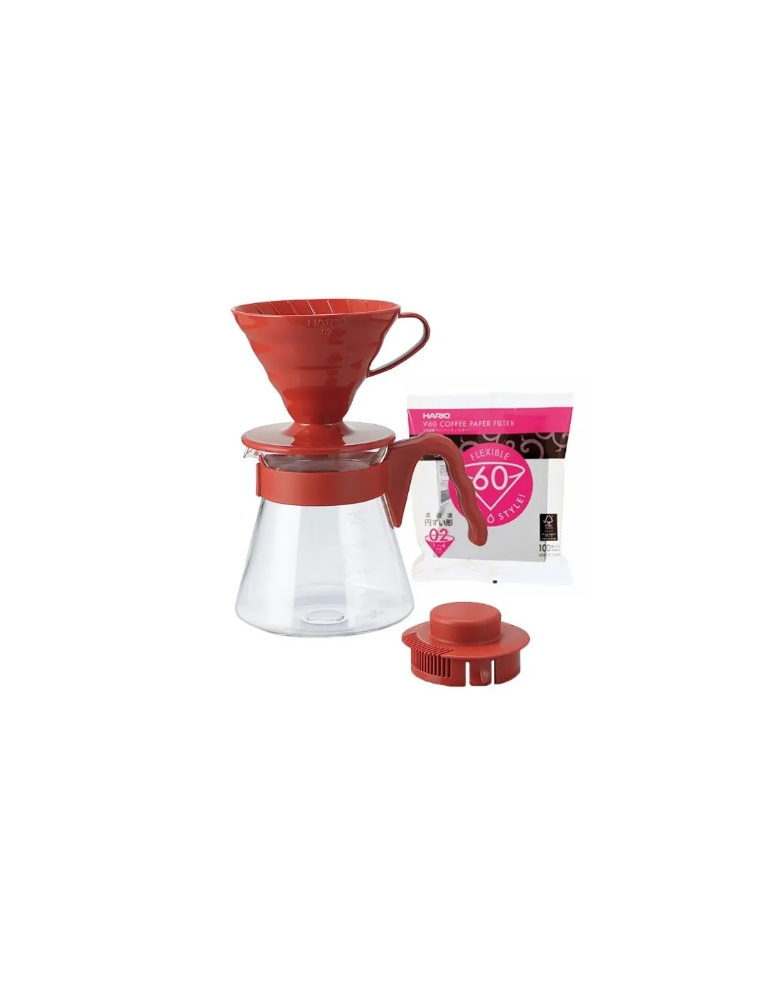 Included in the kit is a red plastic Hario V60-02 dripper for preparing 1-4 cups, a Hario glass teapot with lid and 600ml capacity, 40 unbleached paper filters and a plastic coffee scoop. Simply all nicely put together in premium Hario quality.