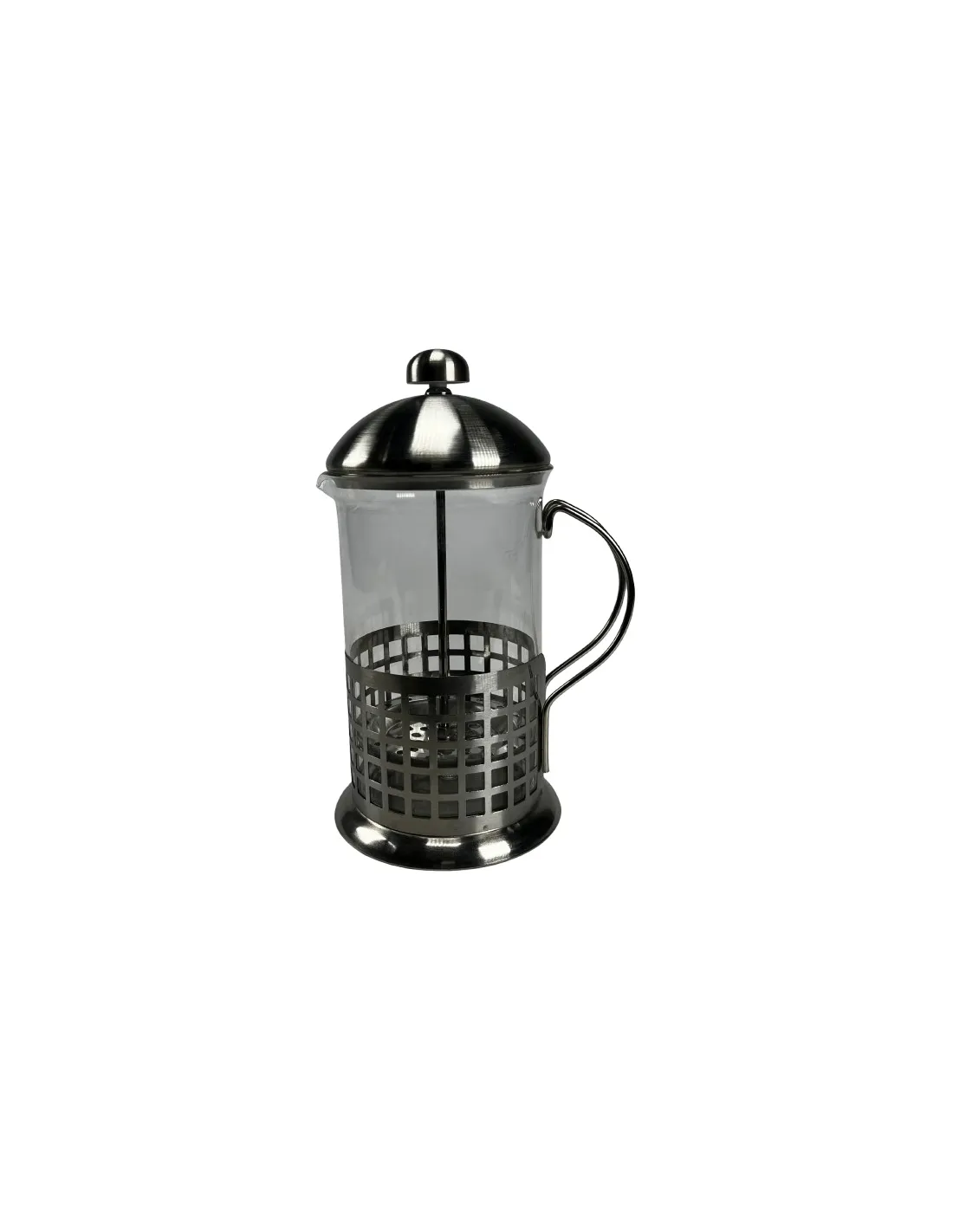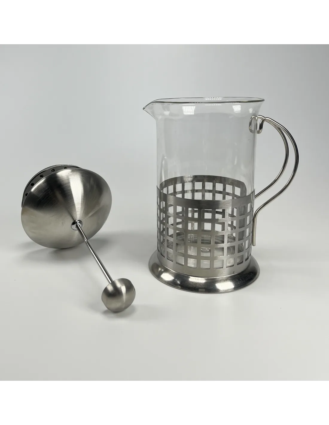 Stainless steel French press with elegant pattern. A simple and popular method of preparing quality coffee.