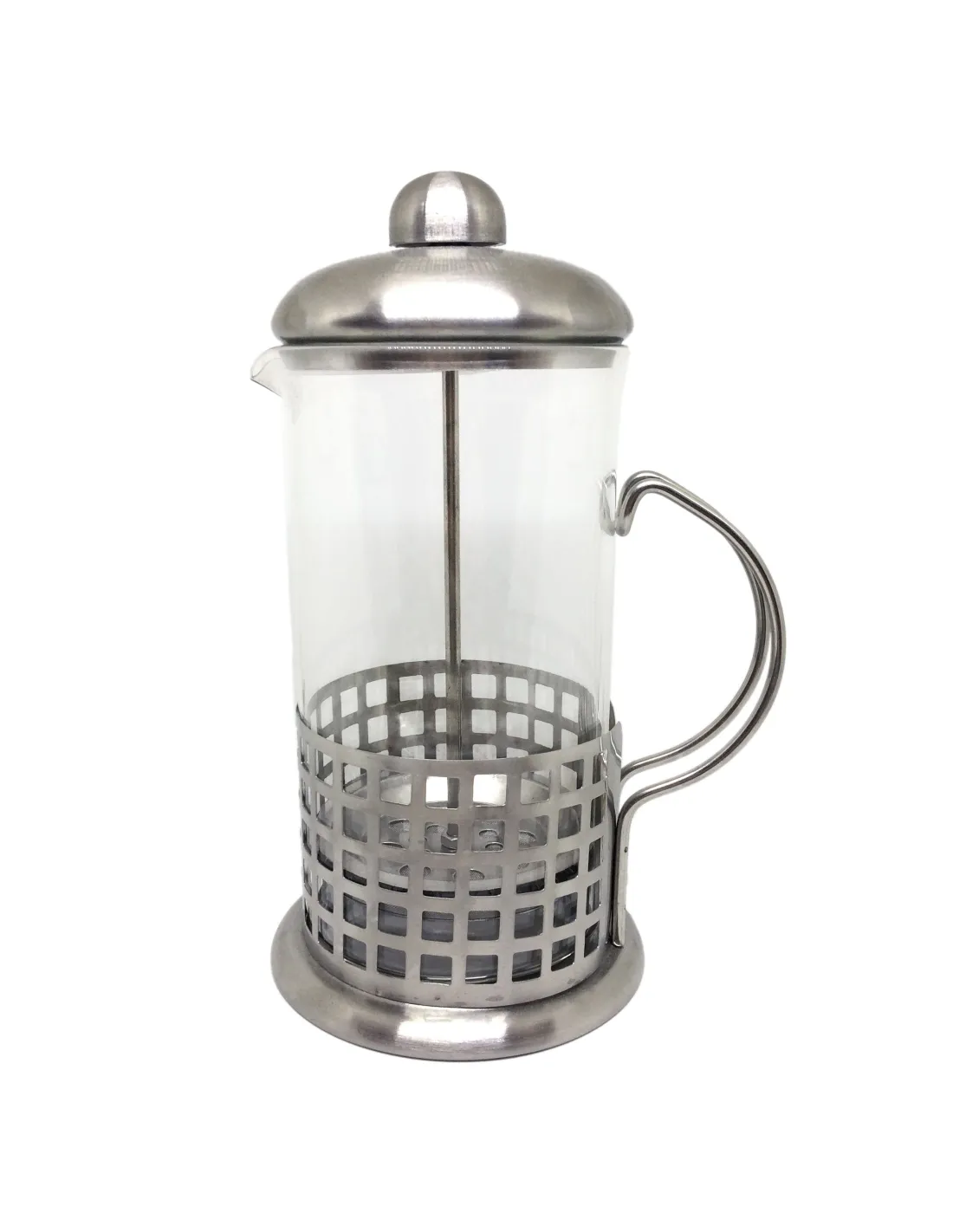 Stainless steel French press with stylish design. Simple and popular method of preparing quality coffee.
