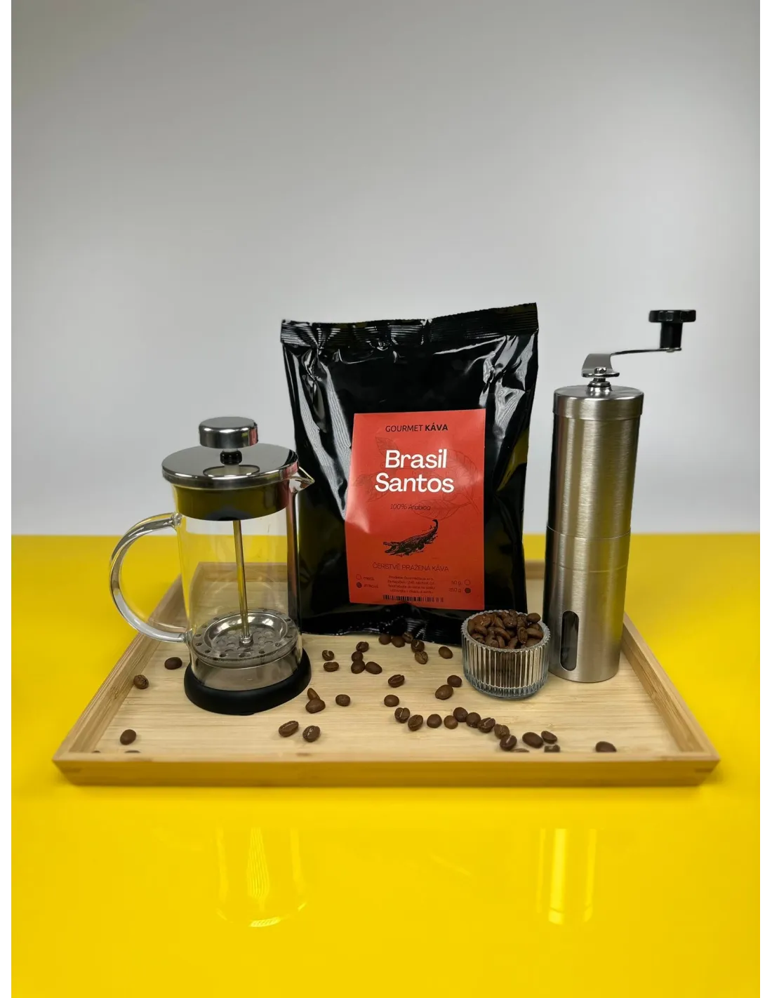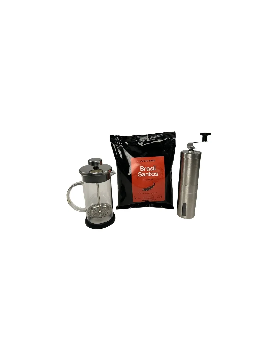 The package includes a manual coffee grinder Kaffia Tall, a 250g pack of 100% arabica coffee Brasil Santos, and last but not least, a stainless steel French press 350ml for easy preparation of fresh coffee!