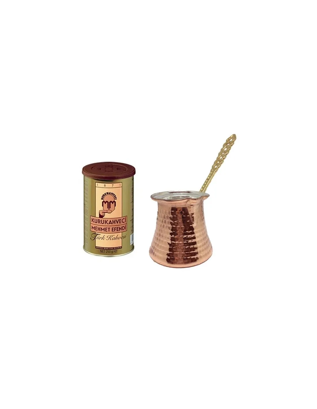 Premium Turkish freshly ground coffee Efendi 250g and a handcrafted cezve L (220-250ml) for traditional and authentic preparation of excellent Turkish coffee.
