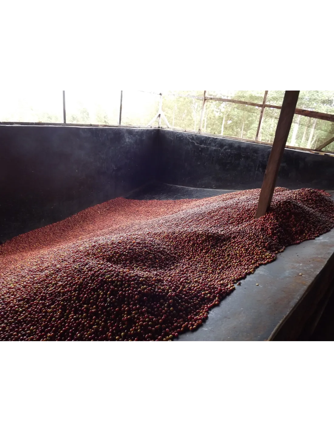 After delivery to the wet mill, the cherries are hand-sorted to remove impurities and black fruit. They are then weighed and recorded. They are then moved to a bin where they are dehulled. After the cherries are peeled using a four-disc press, they are transferred to one of the fermentation tanks where they ferment for approximately 16 to 24 hours, depending on the ambient temperature. The coffee is then thoroughly washed in inclined water channels to remove any residual pulp.
