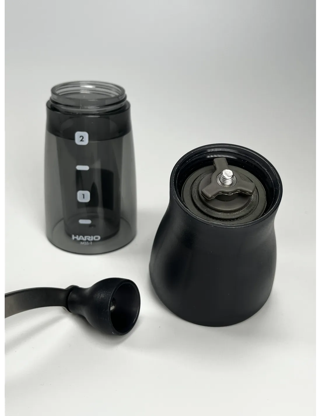The difference from the original version, apart from the noticeable colour change from transparent to dark smoke, is mainly in the improved handle. Unlike its predecessor, the Mini Slim PLUS grinding handle has a hexagonal finish, is more durable and better transfers your force to the grinding stones, resulting in a more even coffee grind and longer grinder life.