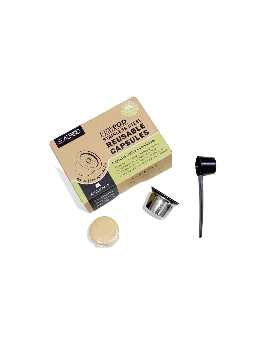 Each package contains: 1x stainless steel Sealpod capsule, 1x plastic measuring cup, 100x paper filter