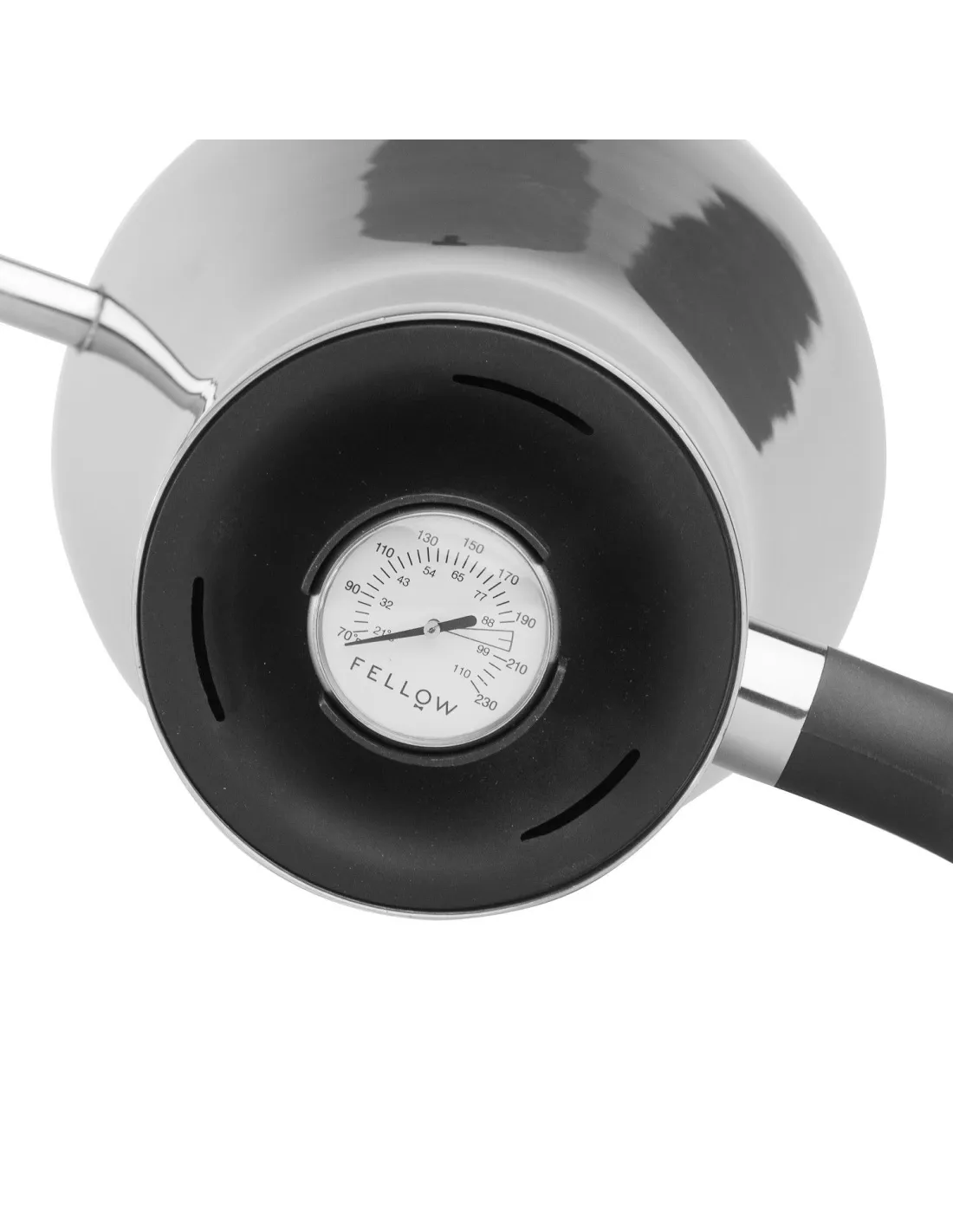 Fellow Stagg 1Lwater jug with integrated thermometer and spout specially designed for precise pouring in alternative coffee preparations. Silver colour.