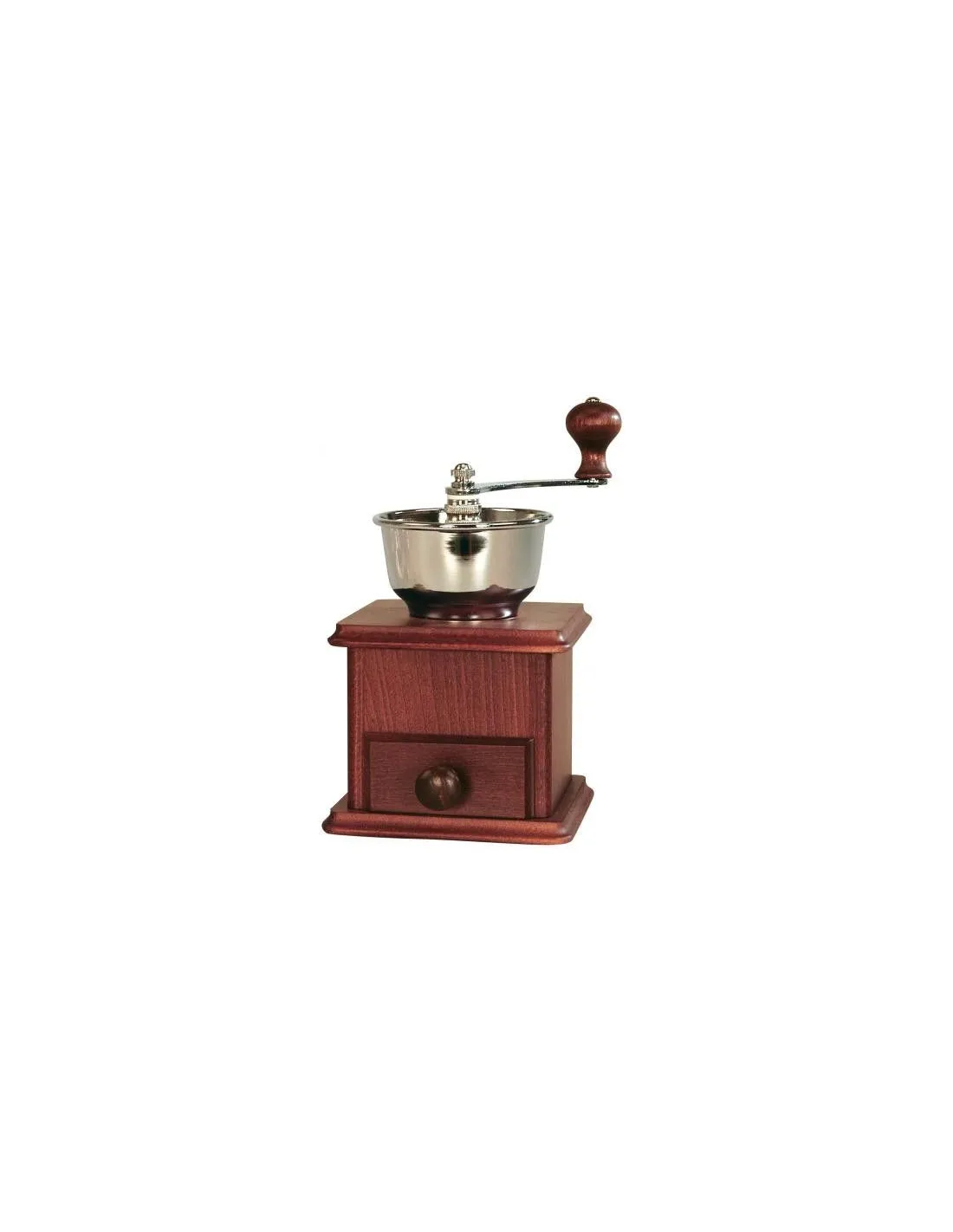 TheLodos grinder in the 1932 series is the exact embodiment of your idea of a traditional coffee grinder. These beechwood mills are largely handmade, so each piece is a little different. The wood is hand-painted and stained to the appropriate shade if necessary. The inner workings are then nickel-plated and the grinding stones are made of hardened steel. The entire grinding system is guaranteed for 10 years.