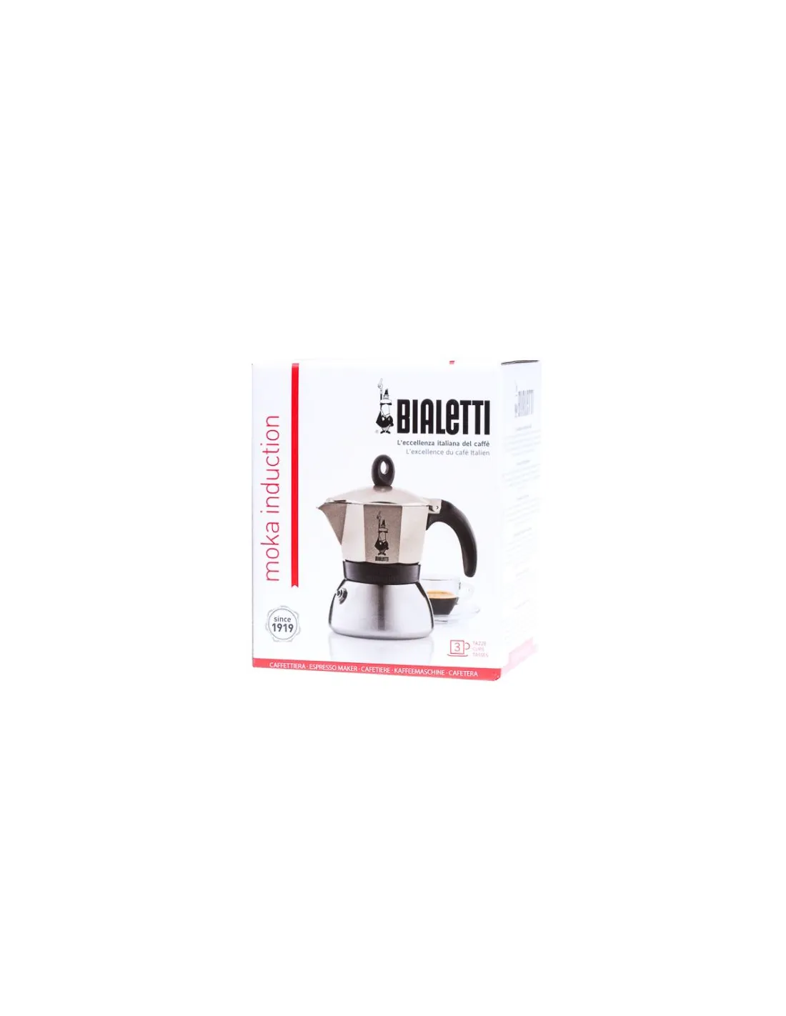 The legendary eight-walled Bialetti moka pot can now also be enjoyed by owners of induction hobs thanks to its stainless steel base. Suitable for 3 cups.