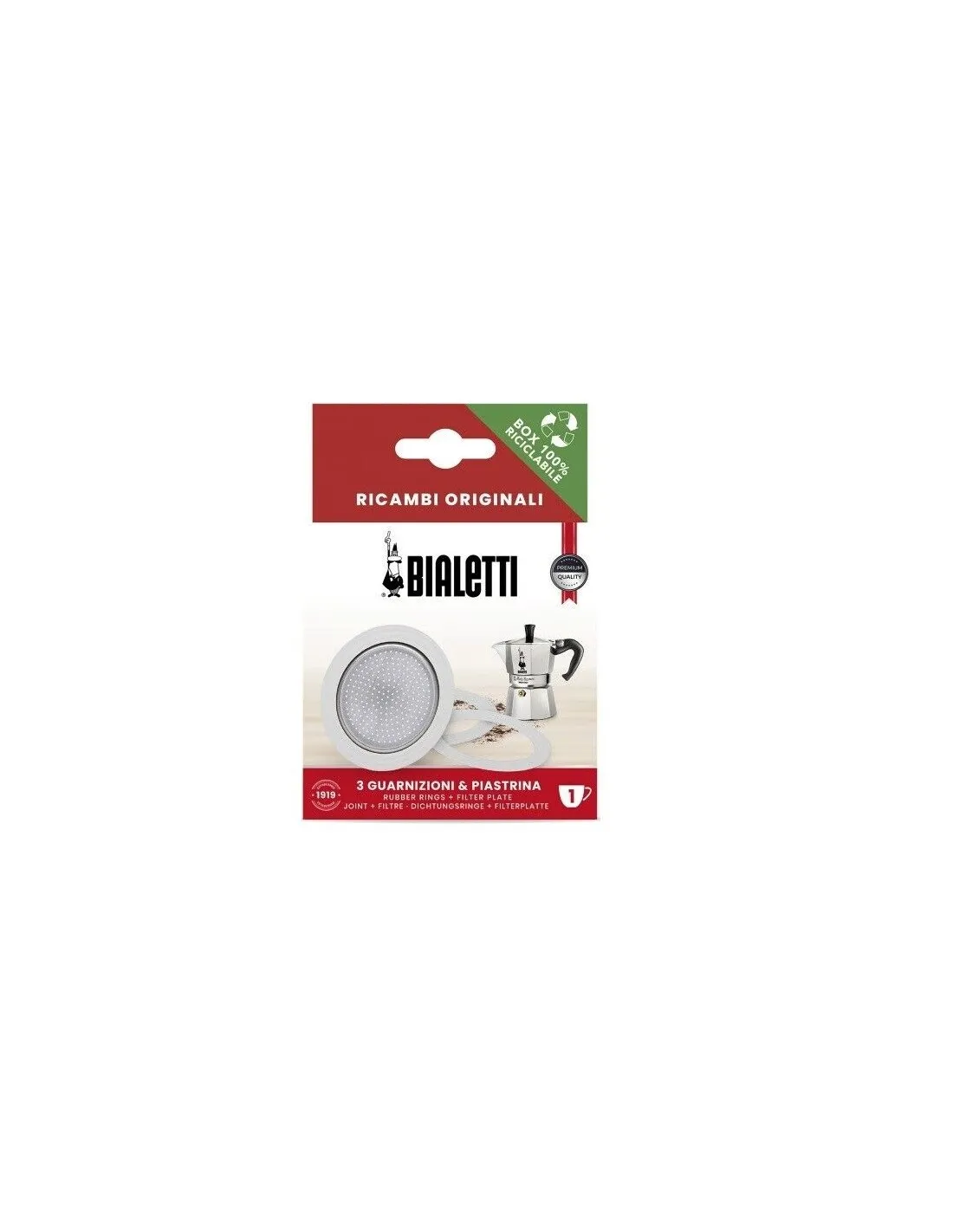 The package contains 3x spare rubber seals for Bialetti aluminium mocha pots in 1 cup size and 1x spare aluminium strainer.
