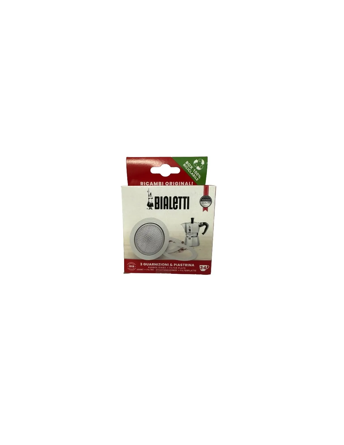 The package contains 3x spare rubber seals for Bialetti aluminium mocha pots in 3 or 4 cup size and 1x spare aluminium strainer.