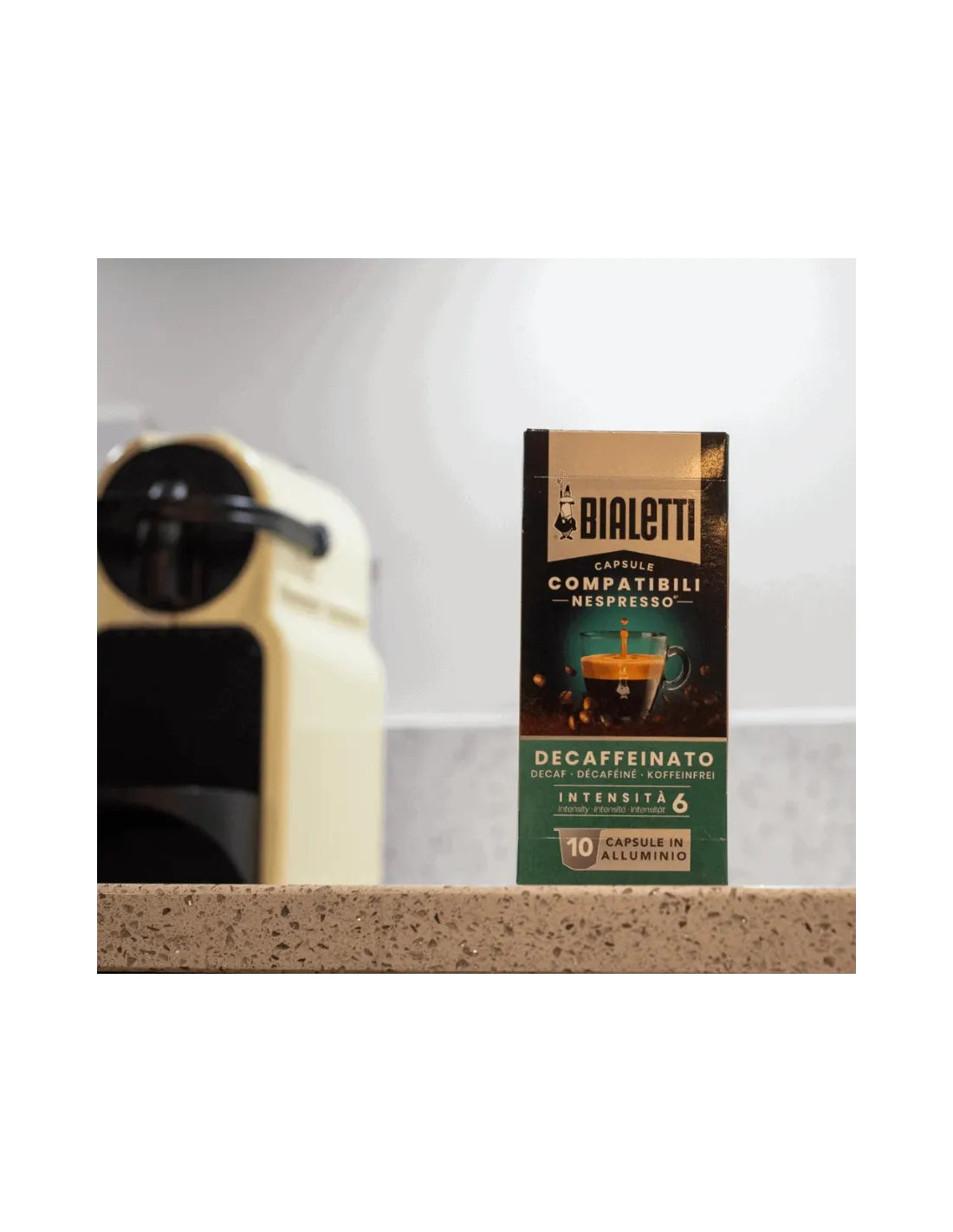 Bialetti Nespresso® Decaf capsules - Italian coffee without compromise! It delivers the rich taste of a true Italian espresso with subtle cereal notes, all without caffeine. Thanks to dark roasting, the coffee retains its intensity and full aroma, so you can enjoy the perfect cup any time of day.