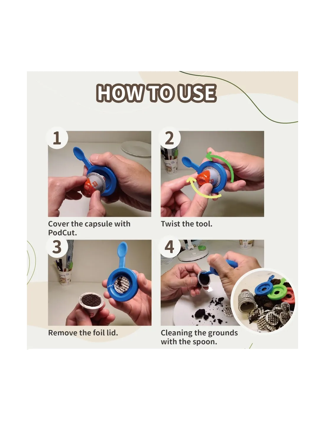 Capsule opener ThePodCut™® is a recycling tool for Nespresso ® coffee capsules that should not be missing in any coffee corner with a capsule coffee machine. This innovative tool is ideal for coffee lovers who are also concerned about ecology. It makes it easy to recycle aluminium capsules and their contents. By properly recycling the capsules , you contribute to environmental protection, while at the same time you can reuse the coffee grounds as fertilizer for flowers or directly for compost, and eliminate the occurrence of annoying flies that often appear around baskets of used capsules.