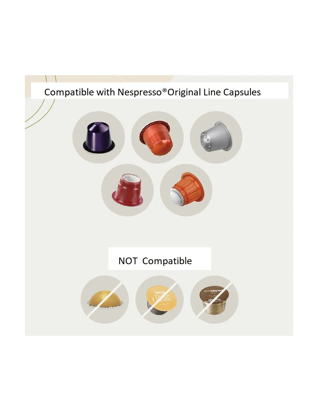 Compatibility: with Nespresso ® Original capsule range. ( NOT COMPATIBLE with Vertuo Nespresso ® range and other brands of capsules )