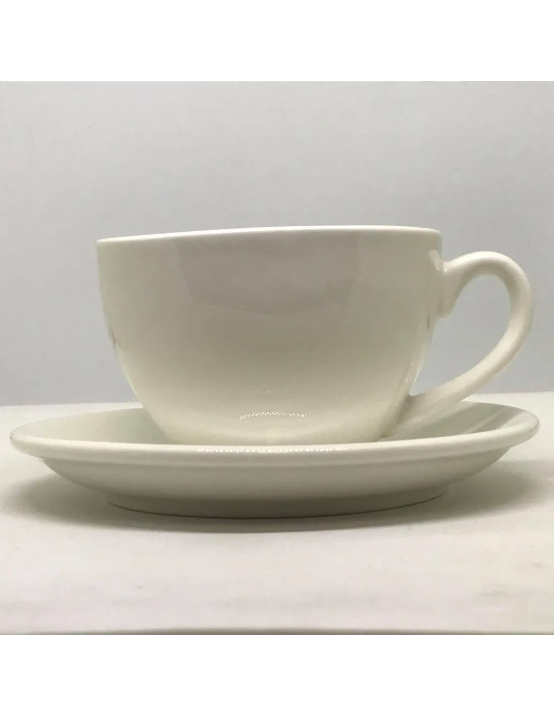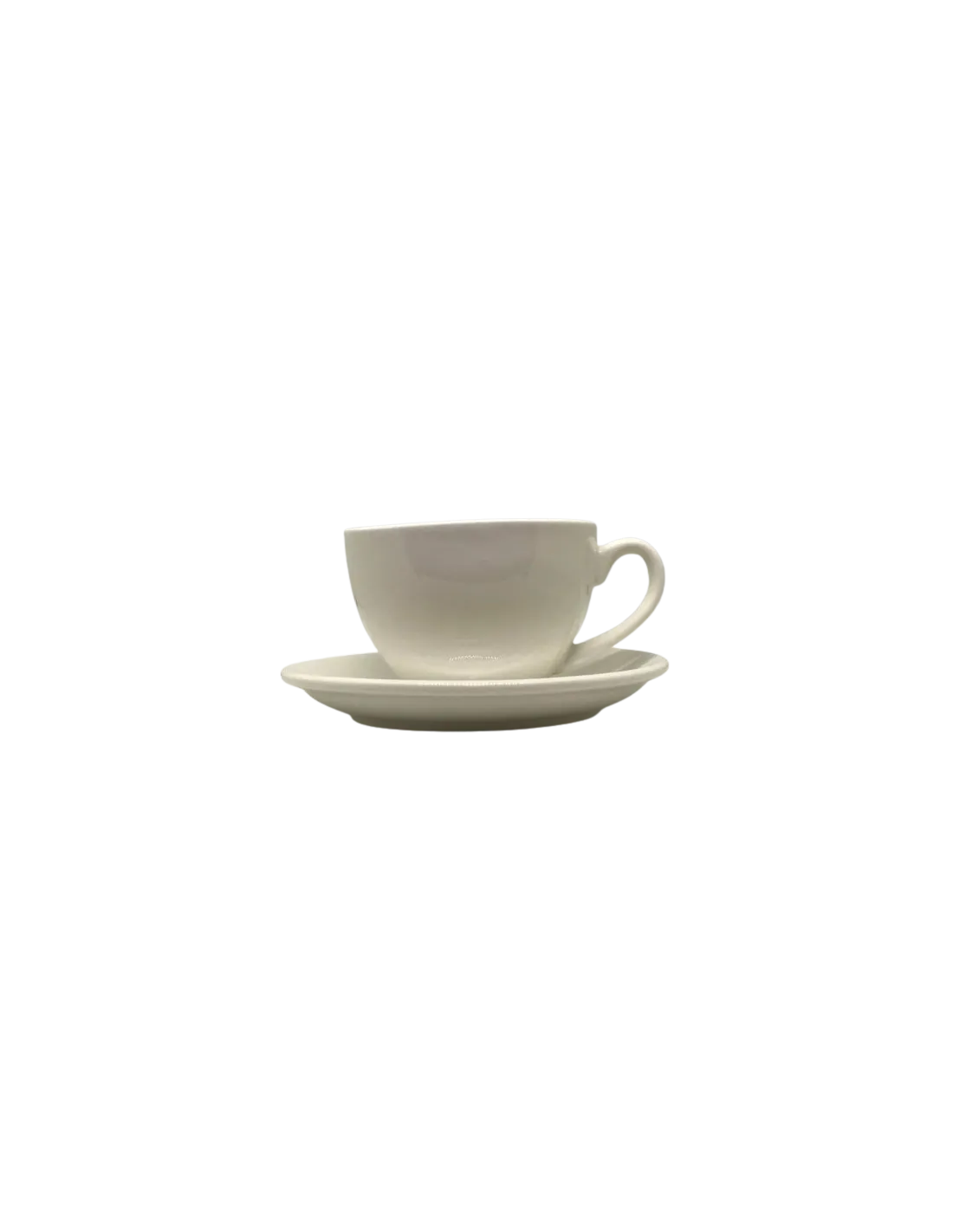 Porcelain cappuccino cup with a volume of 200 ml . It also includes a saucer . Color: white .
