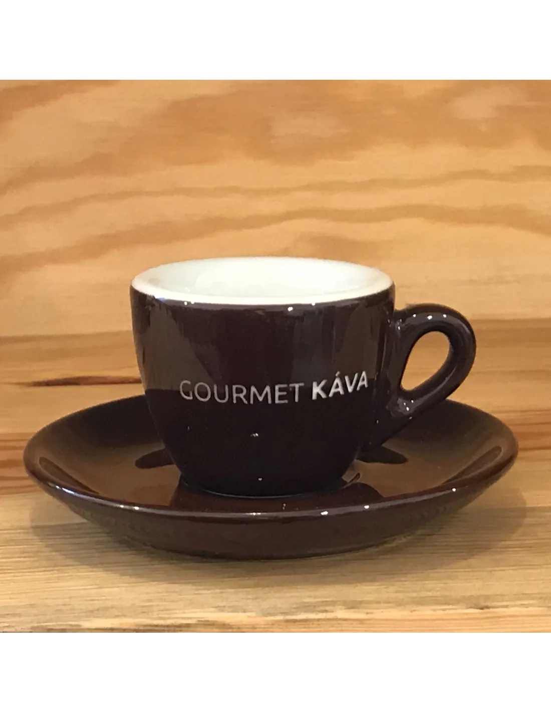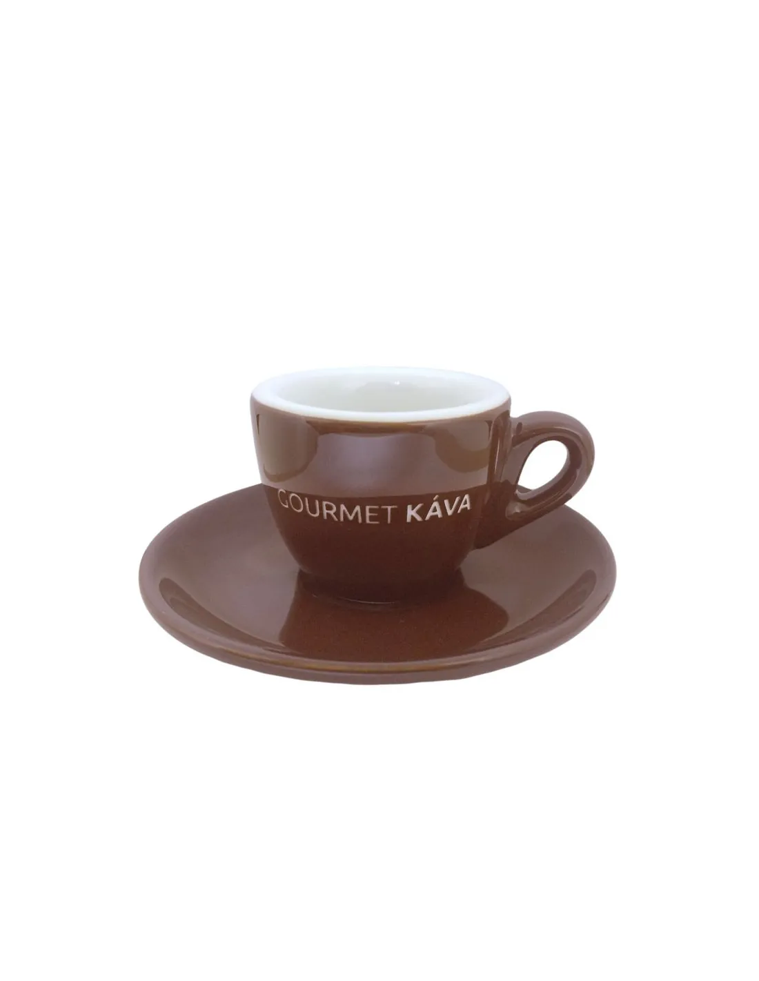 Porcelain espresso cup s with a volume of 70ml suitable for classic or double espresso. Also includes saucer. Colour: brown with white logo.