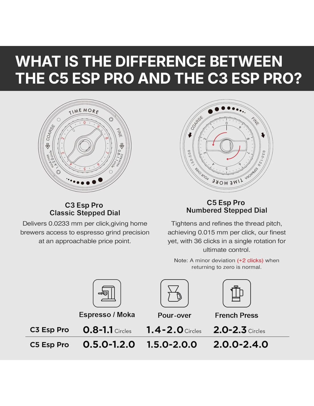 The Timemore C5 ESP PRO hand grinder is an improved version of the popular "C" series - faster, more accurate and more robust. Featuring the new 42mm S2C-042-III stainless steel grinding stones and fine adjustment in 15 micron increments, it is the ideal choice for espresso lovers who want to be in complete control of the grind.
