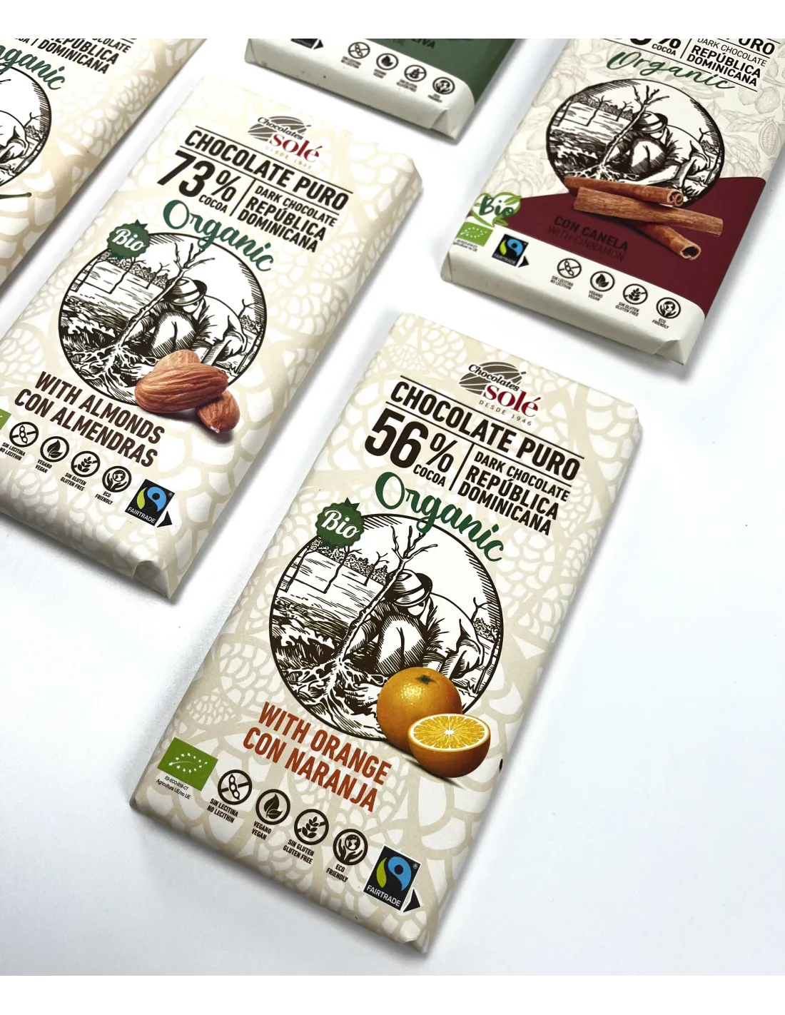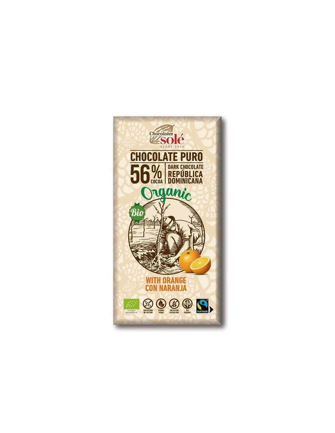 Chocolates Solé - 56% organiczna czekolada z pomarańczą. Smak najlepszego karaibskiego kakao z nutą śródziemnomorskiej pomarańczy.