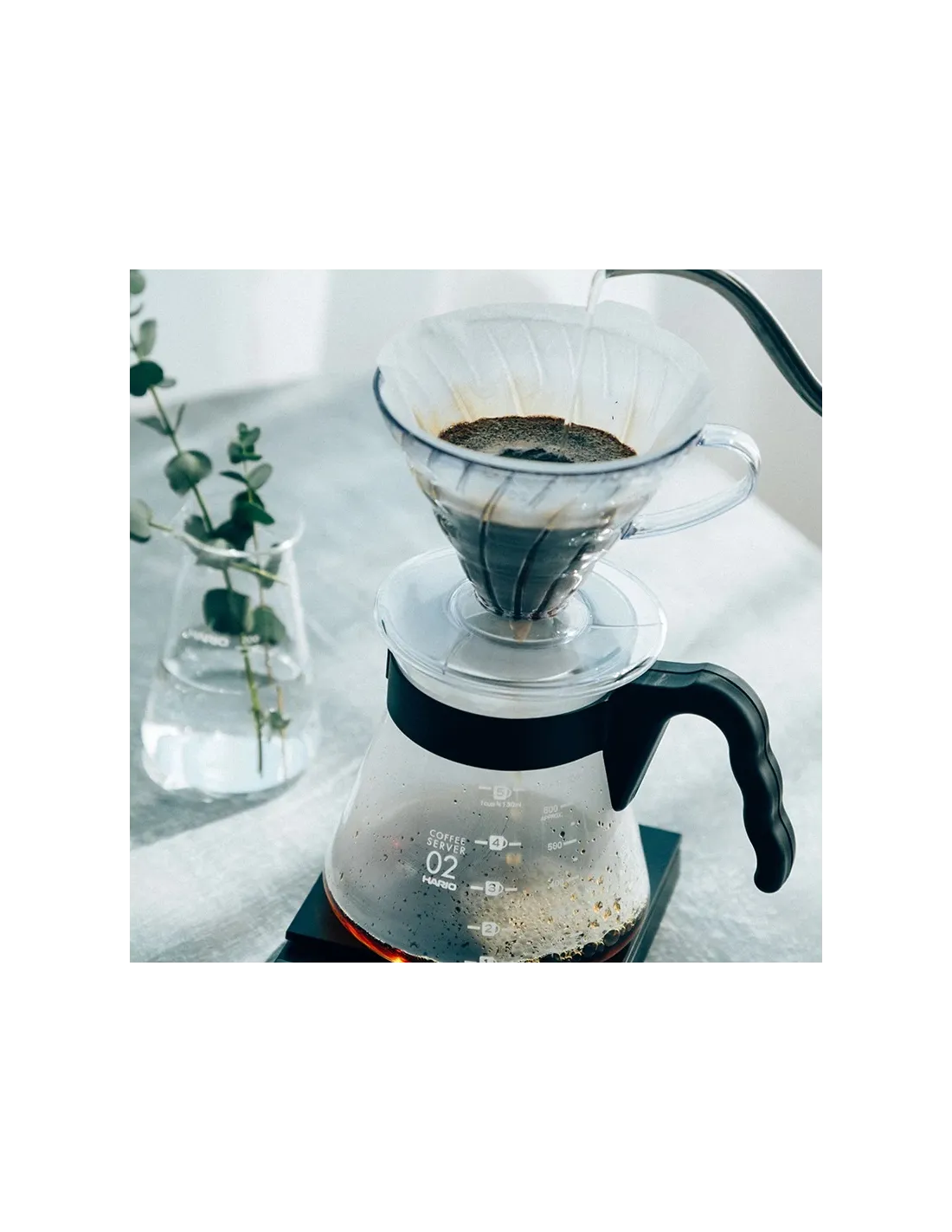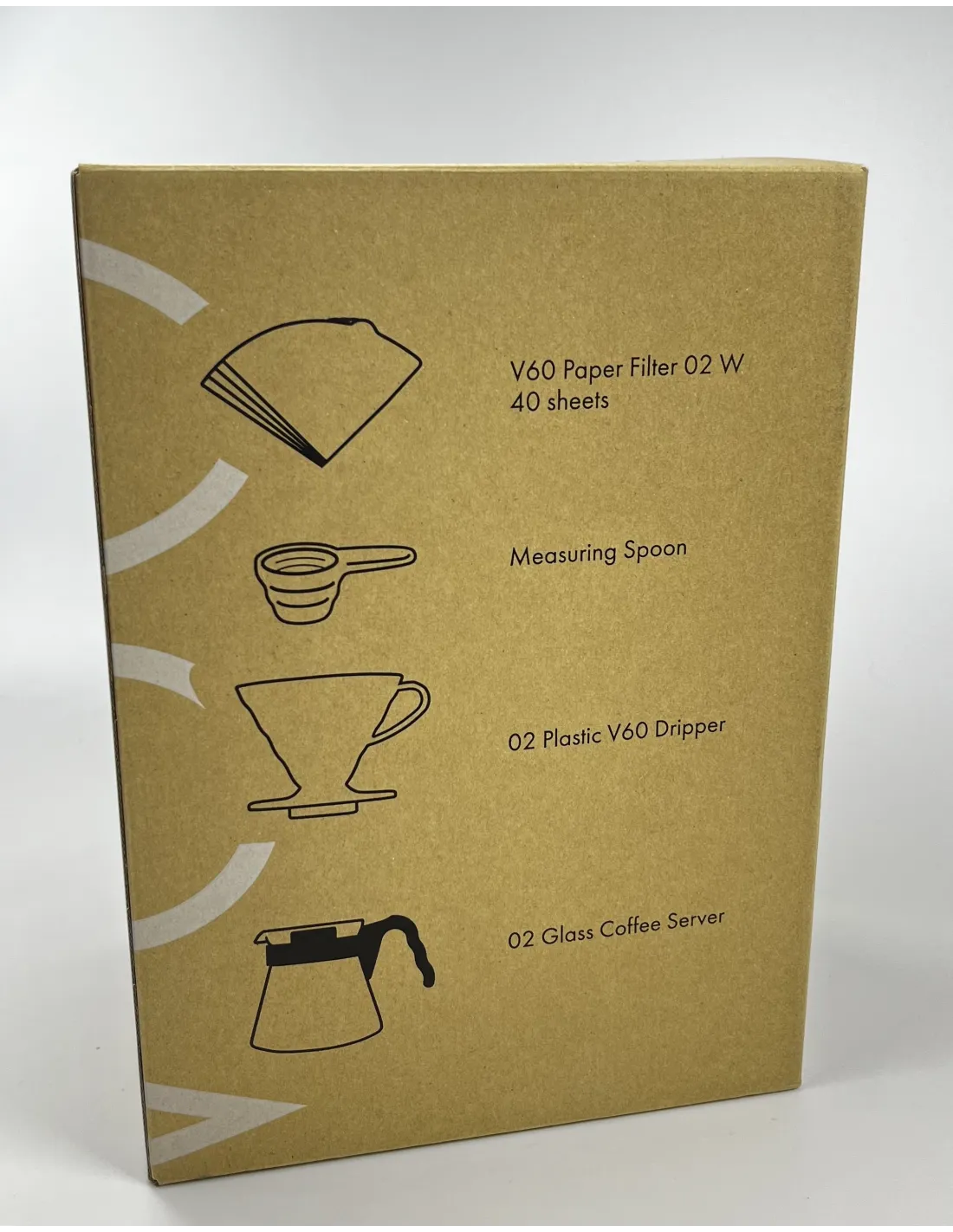 Zestaw zawiera plastikowy dripper Hario V60-02 do przygotowania 1-4 filiżanek, szklany czajniczek Hario z plastikowym uchwytem i pokrywką o pojemności 600 ml, 40 białych papierowych filtrów i plastikową miarkę do kawy. Po prostu wszystko ładnie połączone w najwyższej jakości Hario.